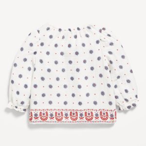Printed Long-Sleeve Double-Weave Top for Baby: round cinched neckline, decorative bow at neck, long puffy sleeves, embroidered flowers at hem, #802098