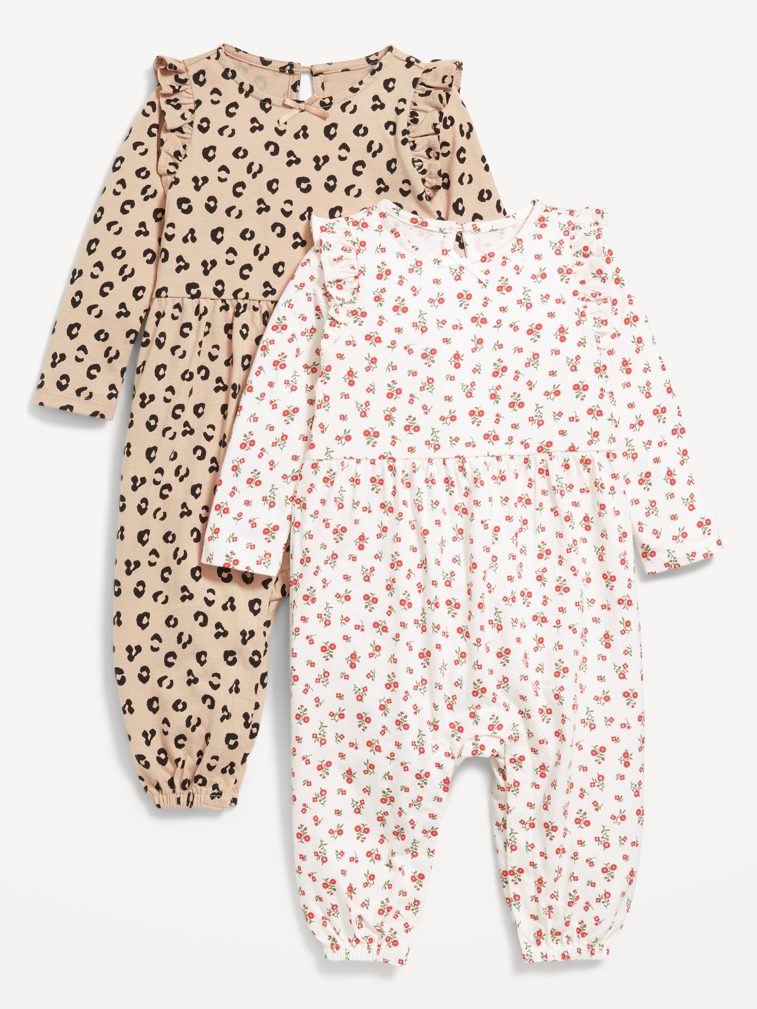 Printed Long-Sleeve Ruffle-Trim One-Piece 2-Pack for Baby