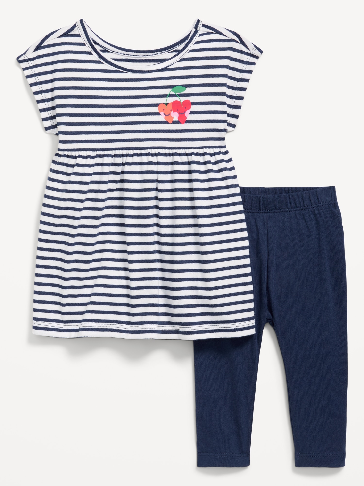Printed Short-Sleeve Dress and Leggings Set for Baby: crew neck, short sleeves, seamed waist, flared skirt, coordinating leggings, elasticized waist, #694108