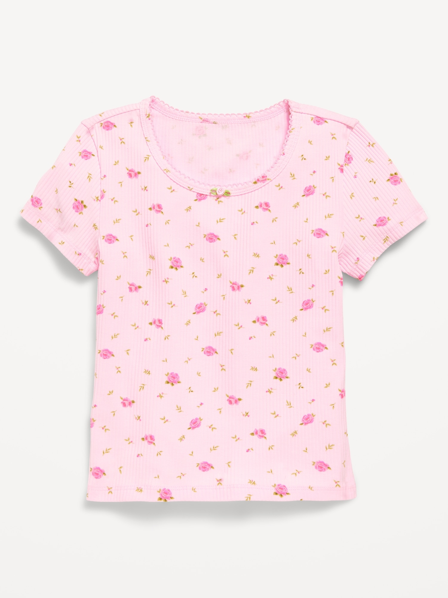 Printed Short-Sleeve Ribbed T-Shirt for Girls: crew neck, picot trim along neckline, short sleeves, all-over floral print, #766971