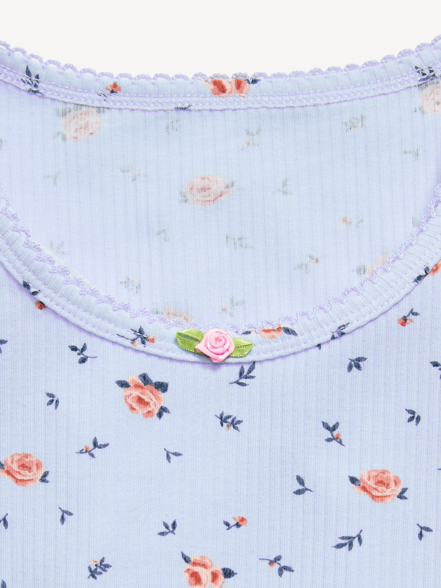 Printed Short-Sleeve Ribbed T-Shirt for Girls: crew neck, picot trim along neckline, short sleeves, all-over floral print, #766971