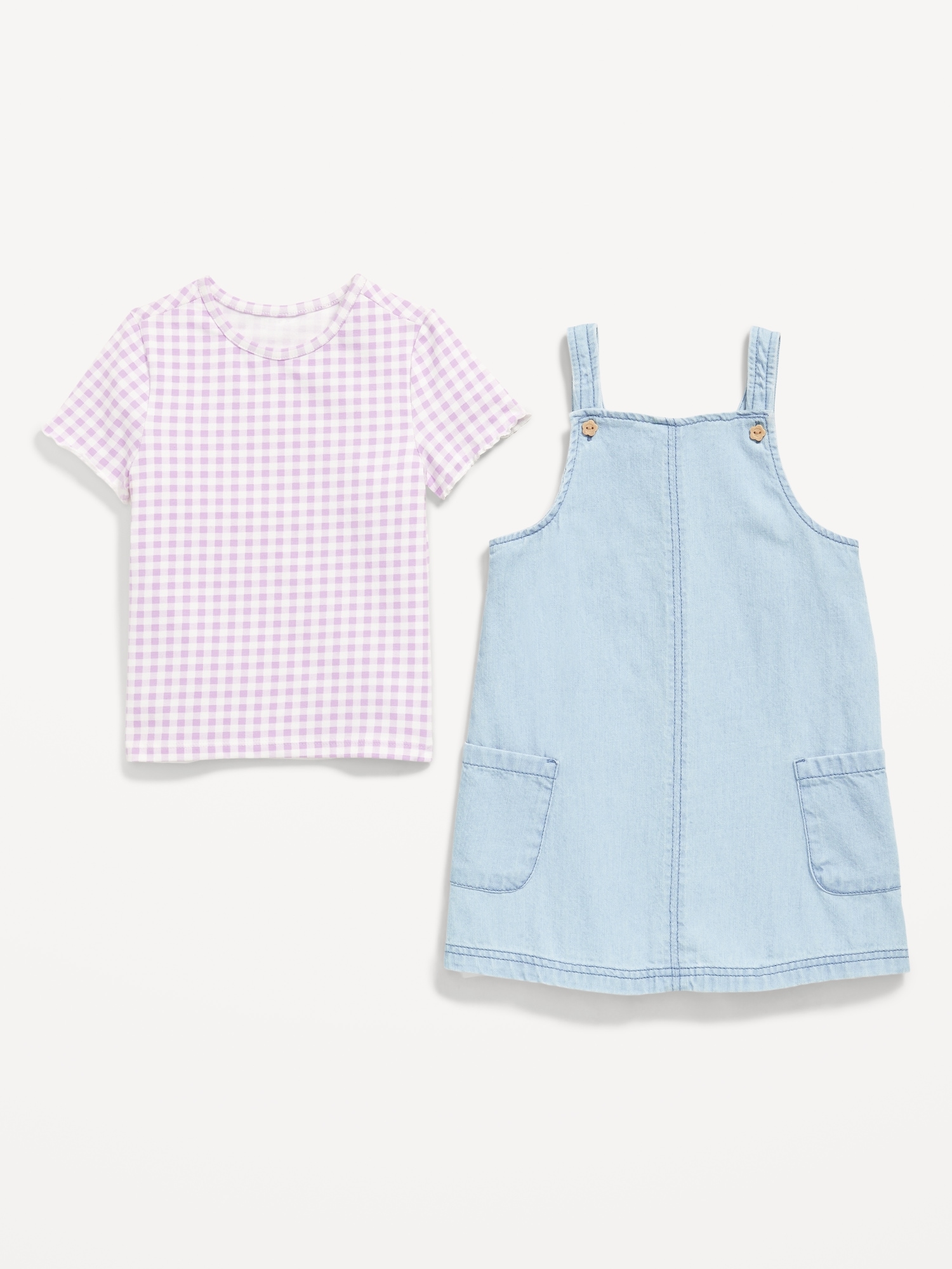 Printed Short-Sleeve T-Shirt and Jean Dress Set for Toddler Girls: crew neck, short sleeves, all-over print, coordinating dress, square neckline, scoop back, adjustable shoulder straps, side patch pockets, #766996