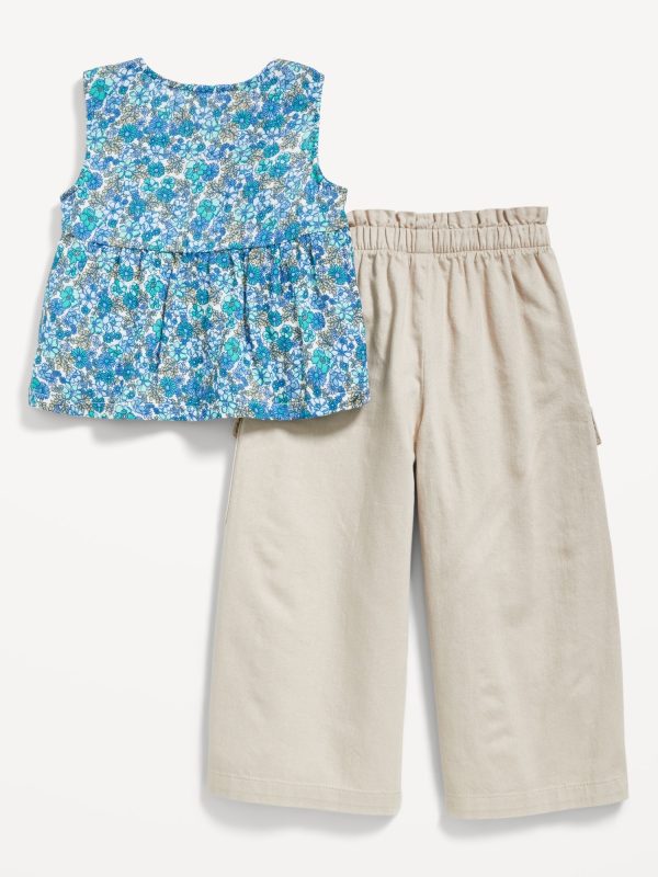 Printed Sleeveless Button-Front Top and Cargo Pants Set for Toddler Girls: round neckline, sleeveless, seamed waist, elasticized button loop placket at front, coordinating pants, elasticized waistband, flap utility cargo pockets at each leg, all-over print, wide leg, #767012
