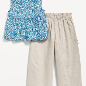 Printed Sleeveless Button-Front Top and Cargo Pants Set for Toddler Girls: round neckline, sleeveless, seamed waist, elasticized button loop placket at front, coordinating pants, elasticized waistband, flap utility cargo pockets at each leg, all-over print, wide leg, #767012