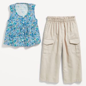 Printed Sleeveless Button-Front Top and Cargo Pants Set for Toddler Girls
