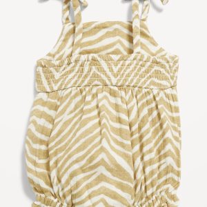 Printed Sleeveless Double-Weave One-Piece Romper for Baby: square neckline, thin shoulder straps, decorative ties at straps, seamed waist, smocked back, elasticized bubble leg cuffs, hidden snaps along inseam, all-over pattern, #761803