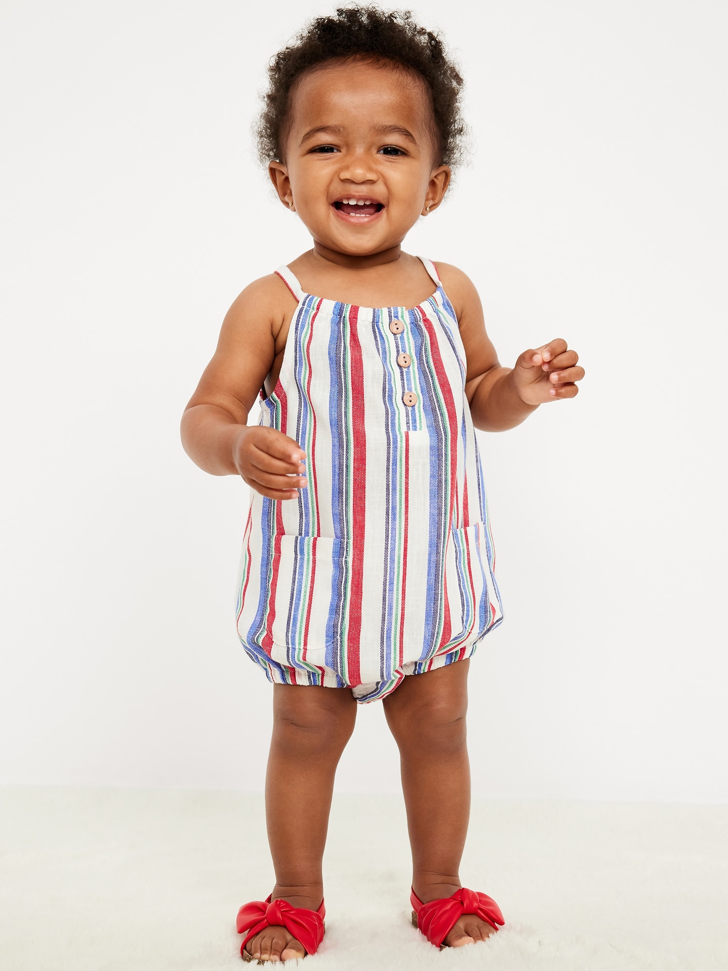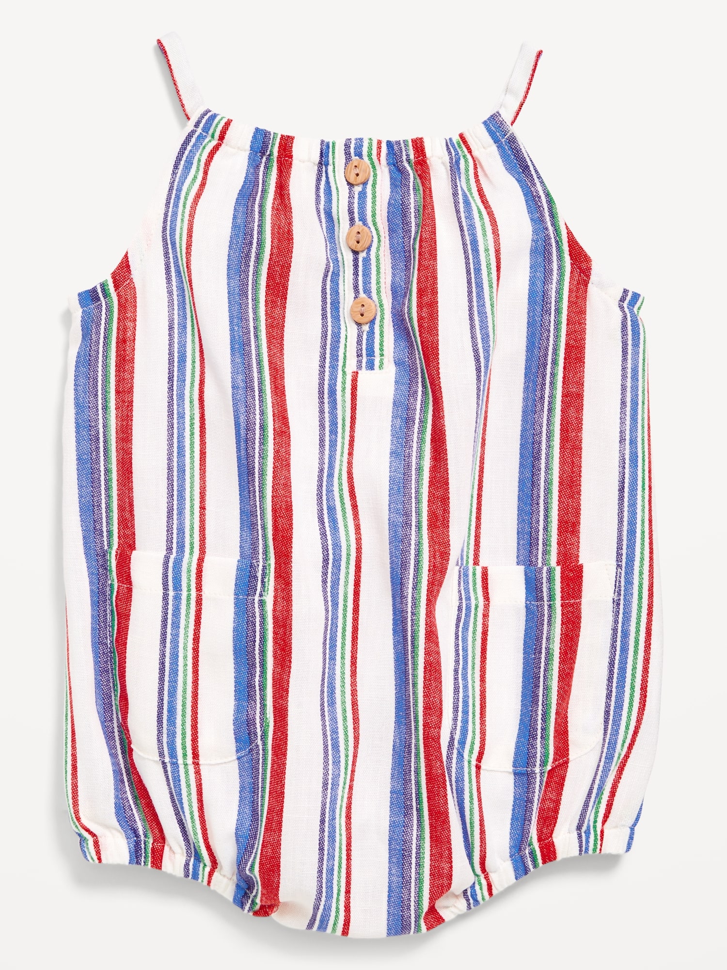 Printed Sleeveless Henley One-Piece Romper for Baby: cinched round neckline, sleeveless, three-button placket, patch pockets at front, elasticized bubble leg openings, hidden snaps along inseam, all-over print, #761809