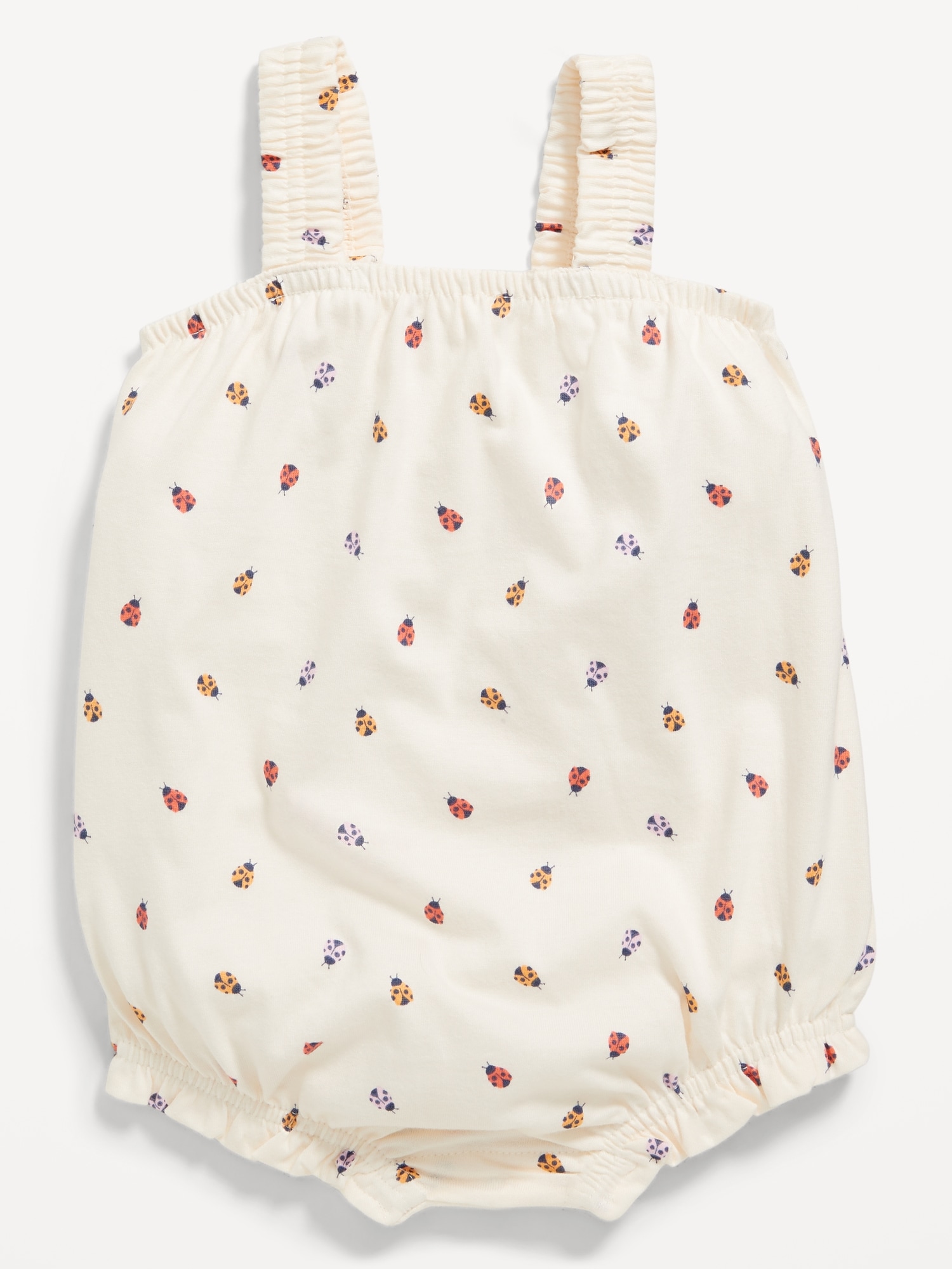 Printed Sleeveless One-Piece Romper for Baby: straight elasticized neckline, sleeveless, elasticized bubble leg cuffs, hidden snaps along inseam, all-over print, #689369