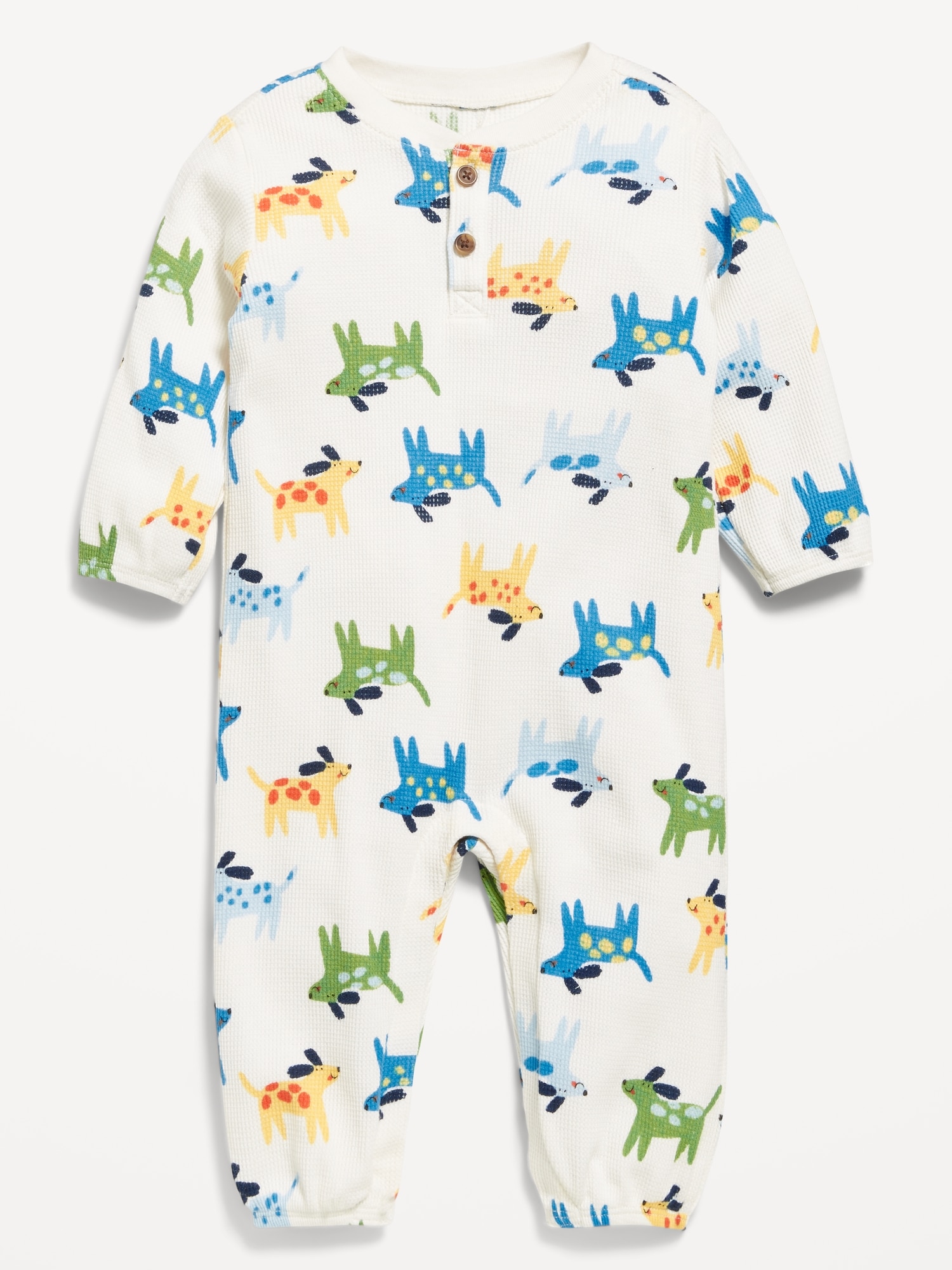 Printed Waffle-Knit Henley One-Piece for Baby: crew neck, two-button henley placket, long sleeves, hidden snaps along inseam, #804450