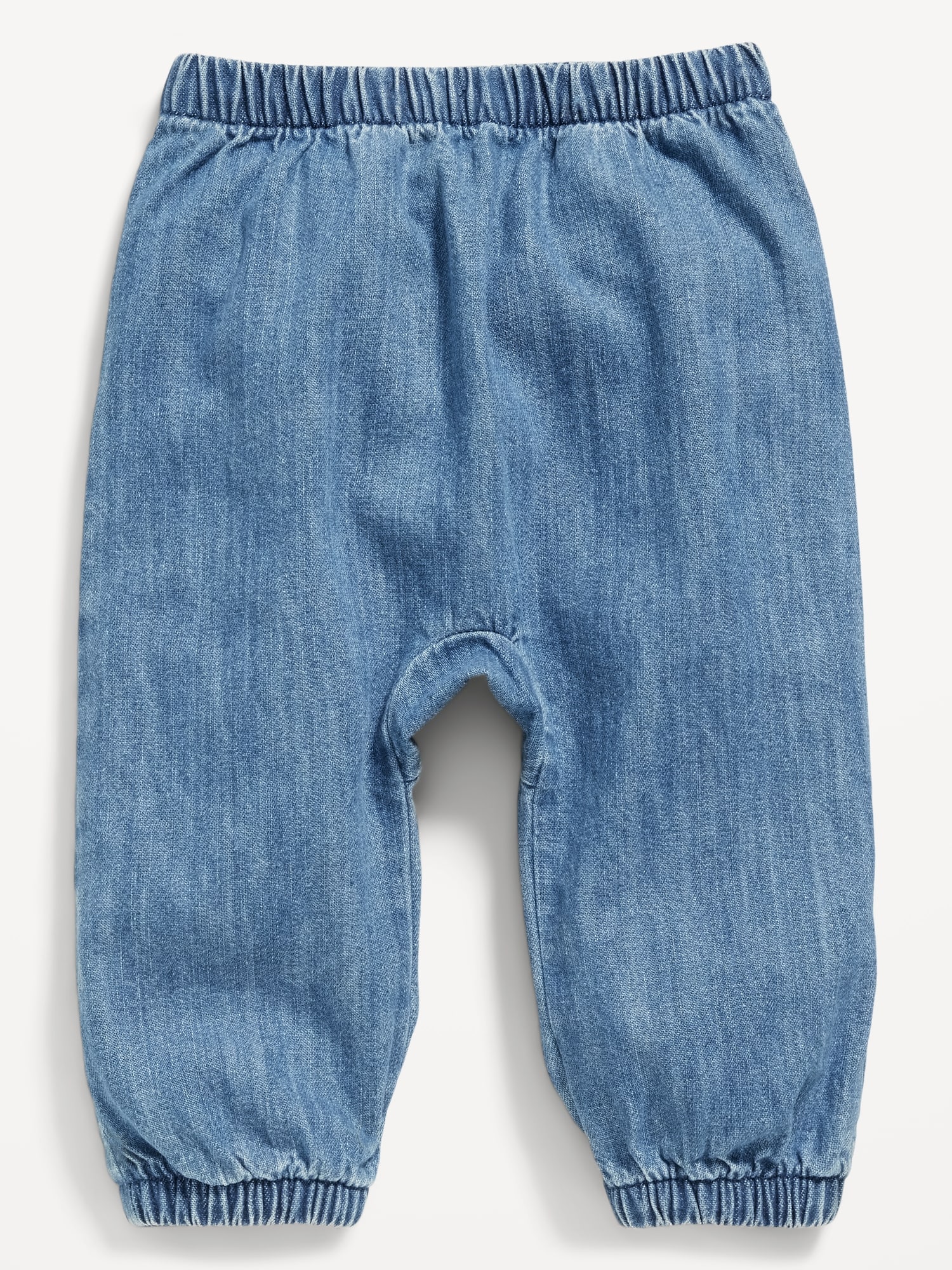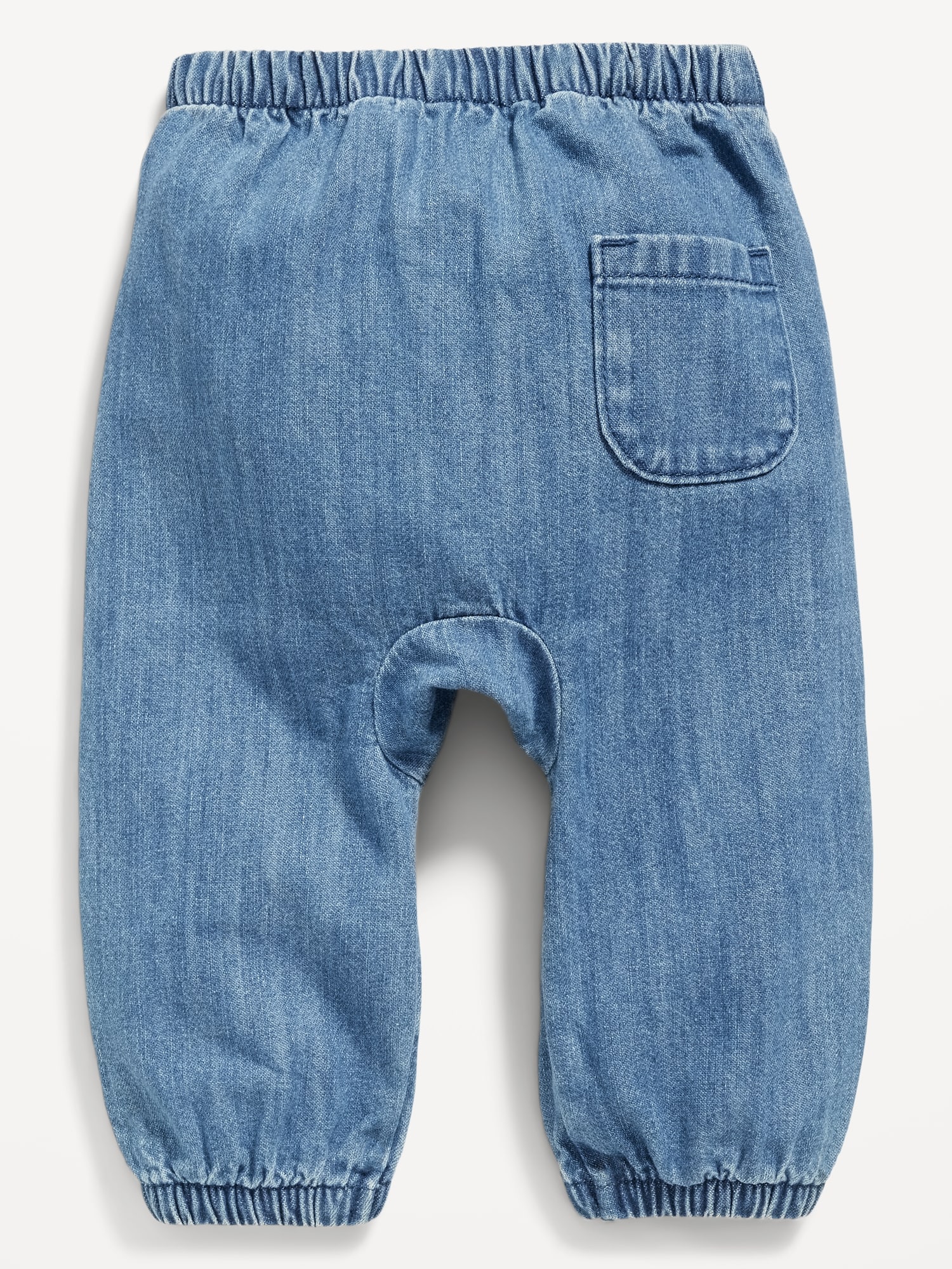 Pull-On Chambray Pants for Baby: elasticized waistband, patch pocket at back, knee patches, elasticized leg cuffs, easy pull-on style, #802715