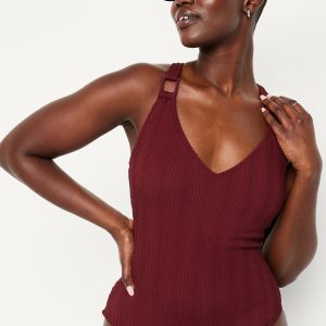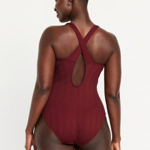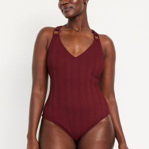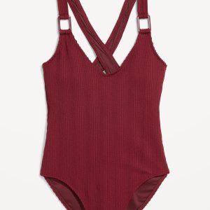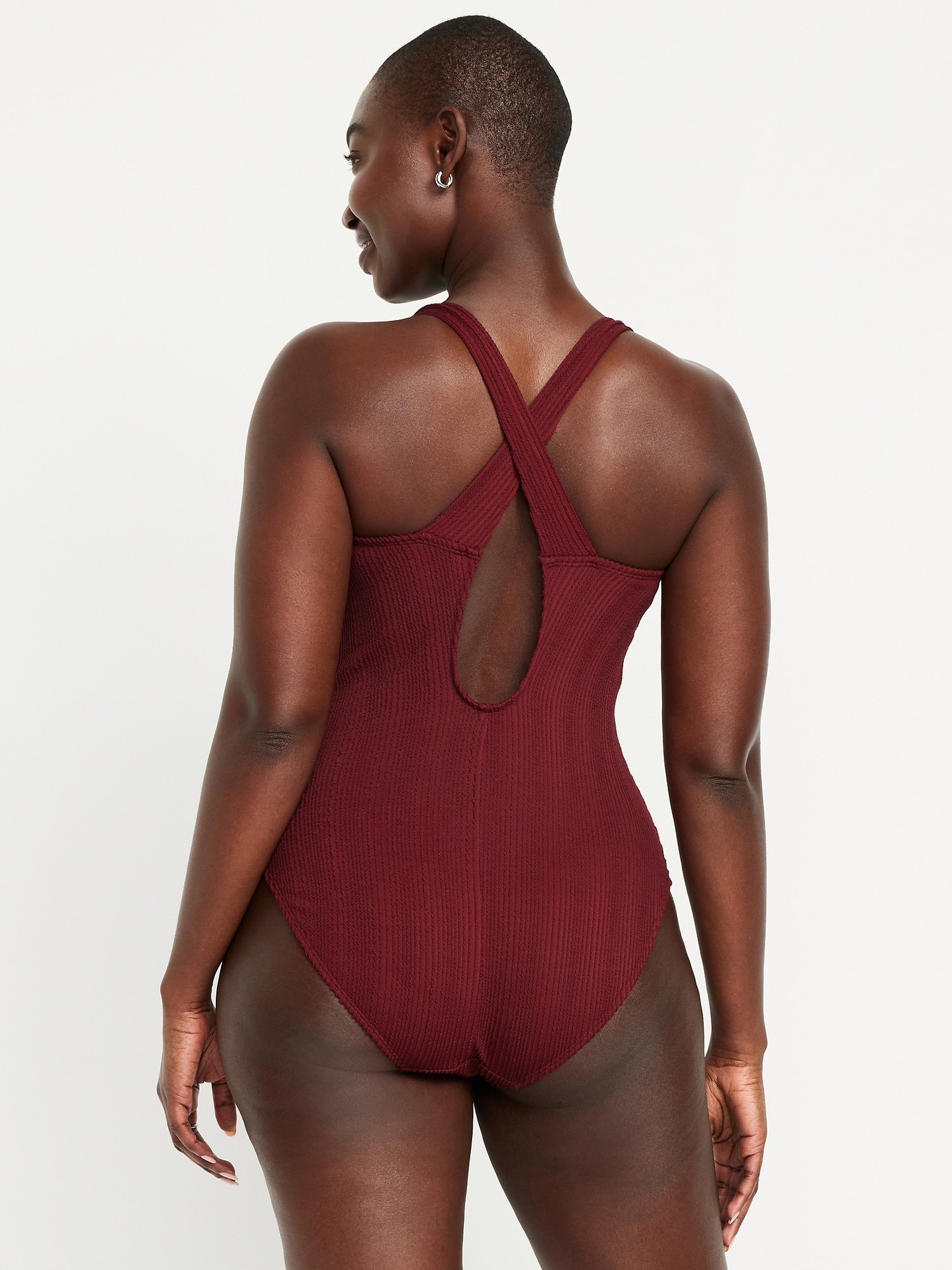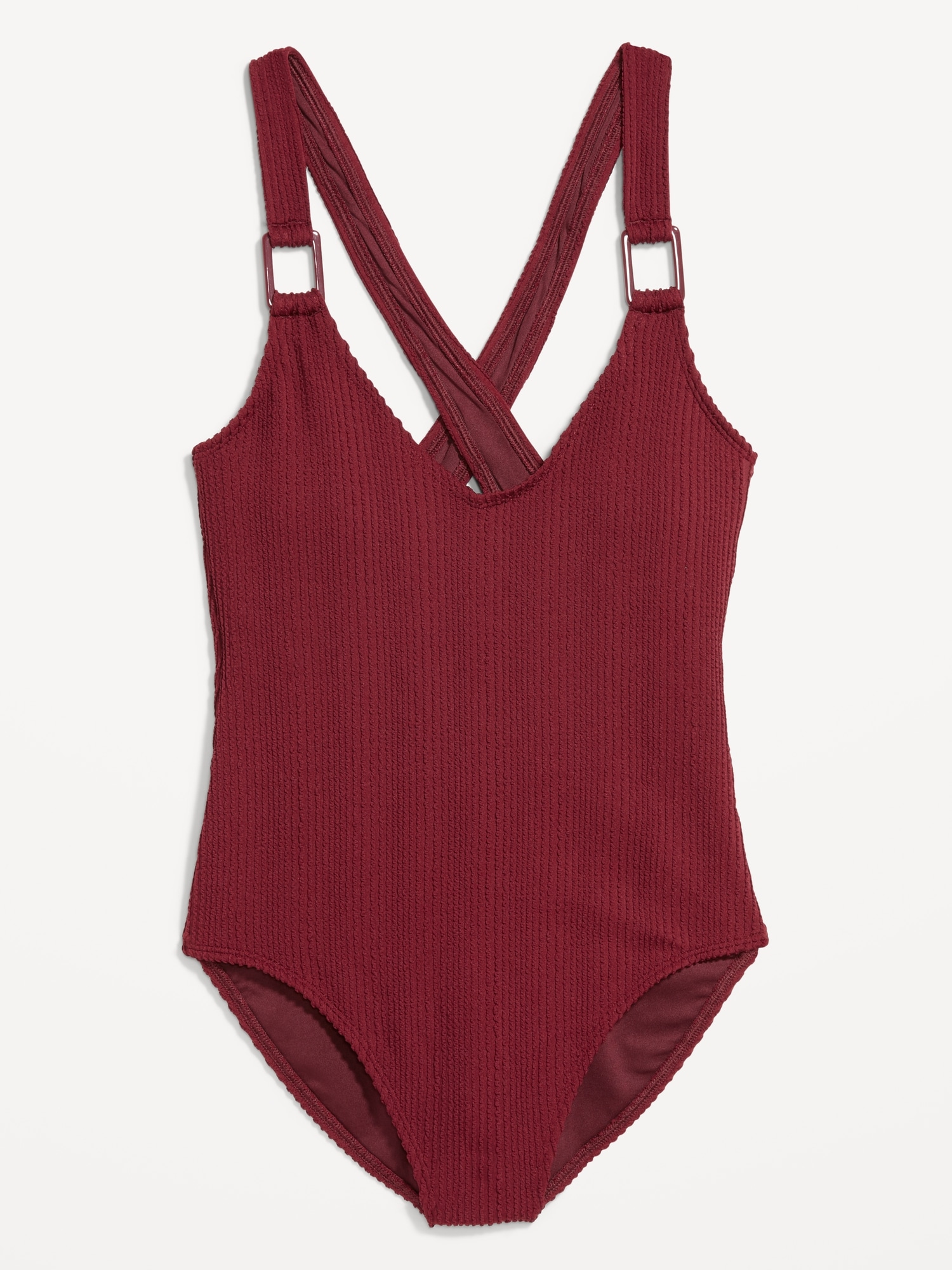 Ribbed One-Piece Swimsuit: v-neck, cross-back straps, removable pads, elastic leg openings, #660802