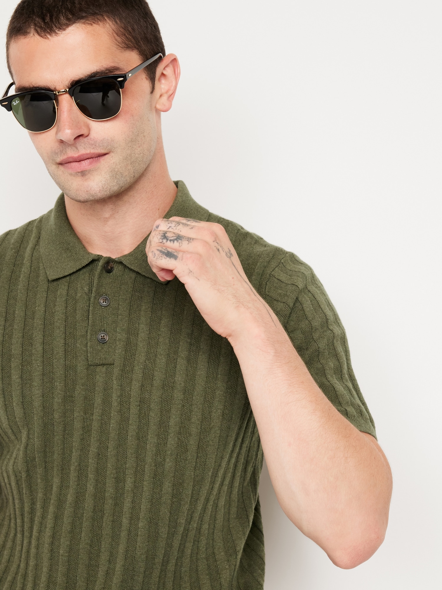 Ribbed Polo Sweater: spread collar, short sleeves, buttoned placket, pullover style, #802042