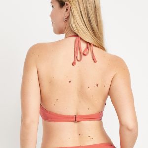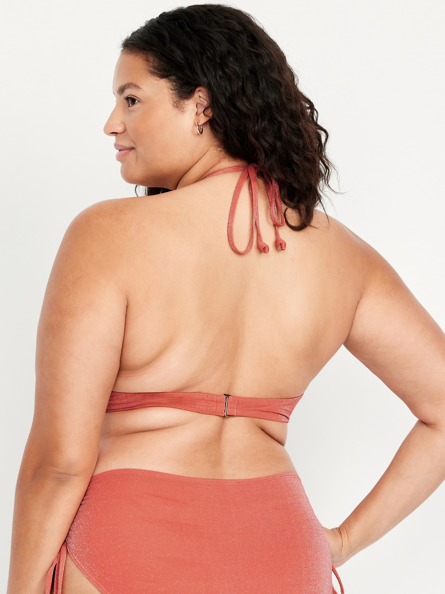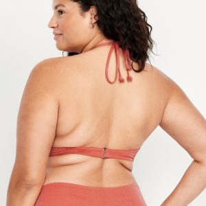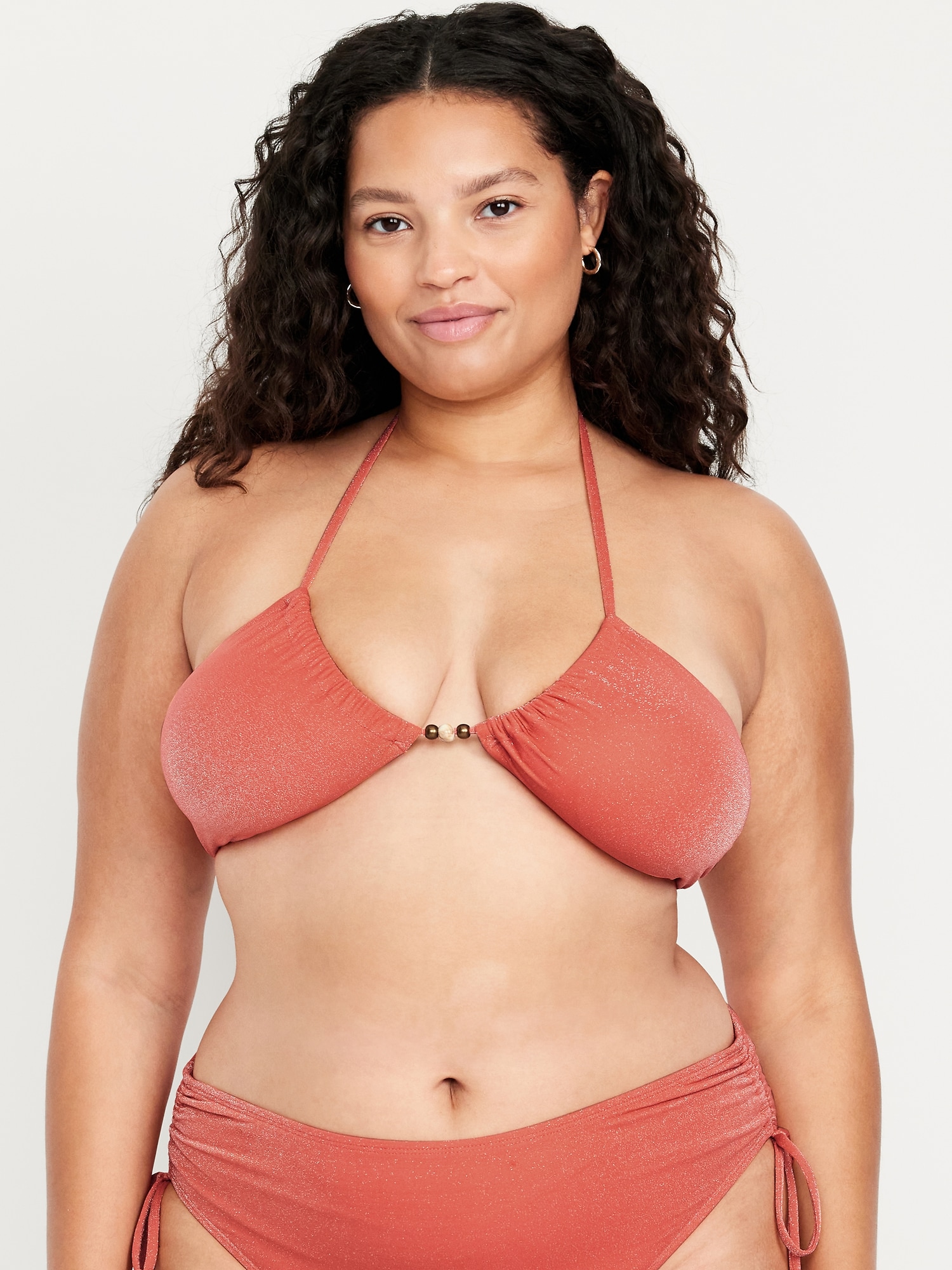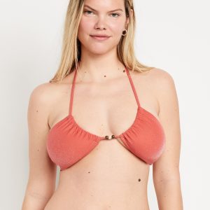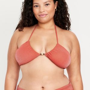 Ruched Bikini Swim Top: halter spaghetti straps, ruched front, back clasp, metallic shine, #660839