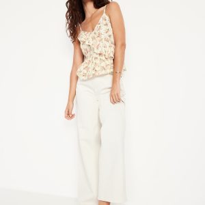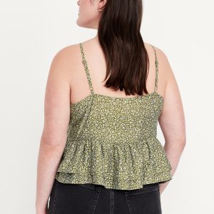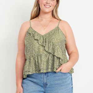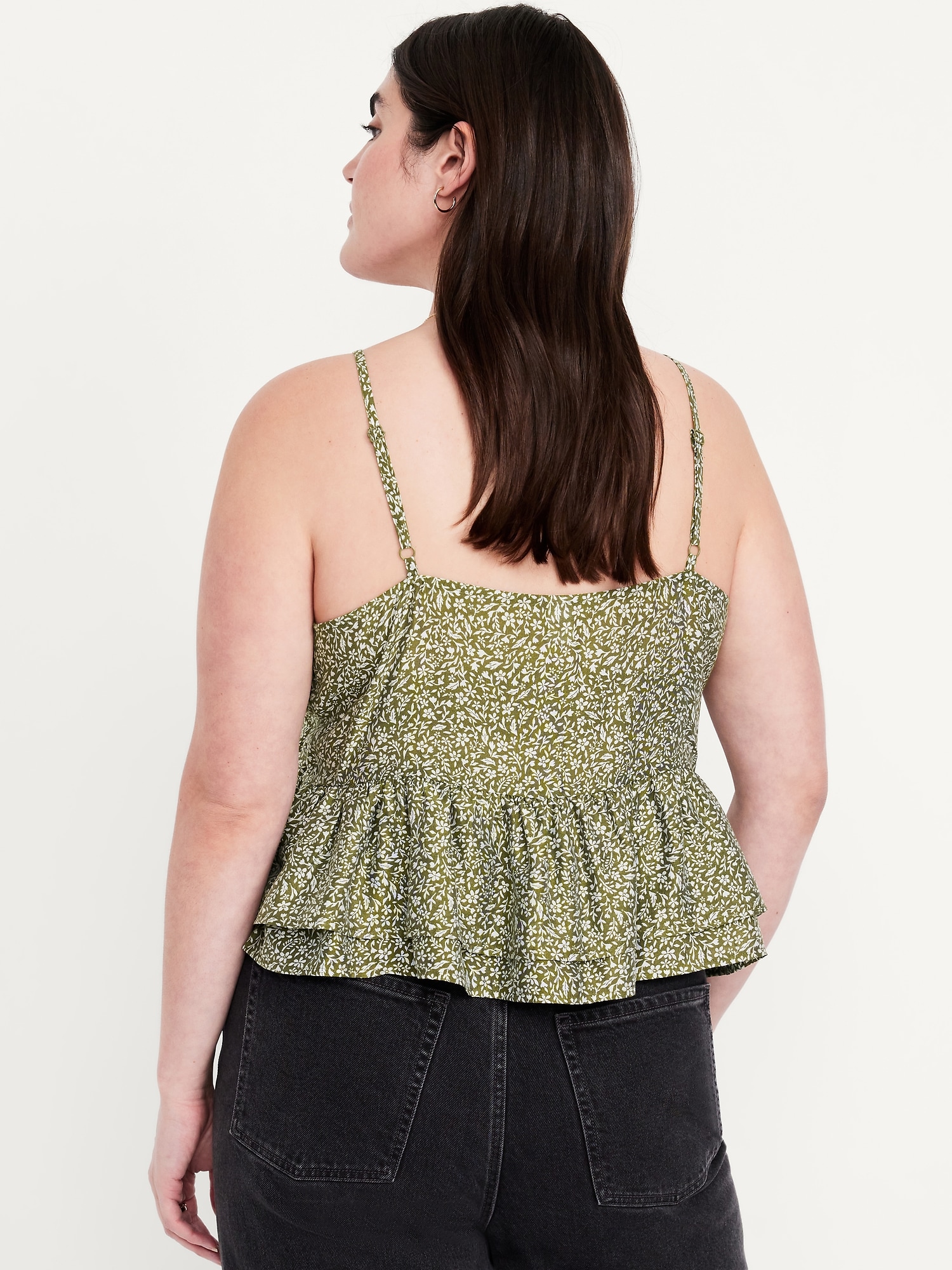 Ruffle Cami Top: v-neck, adjustable spaghetti straps, front ruffle trim, shirred peplum hem, #805745
