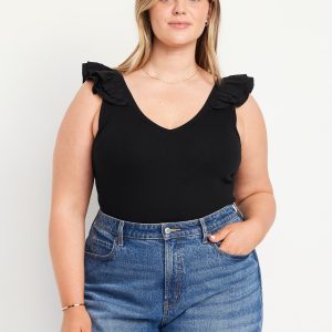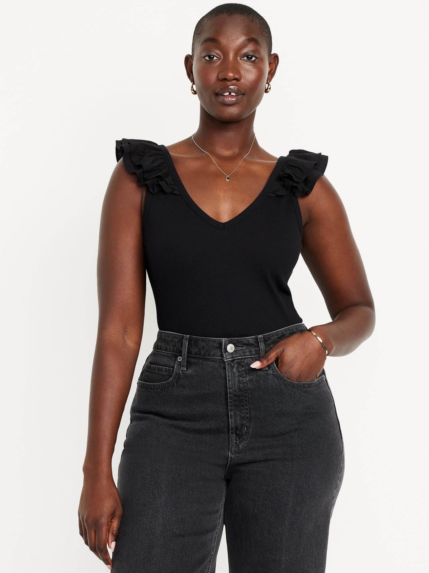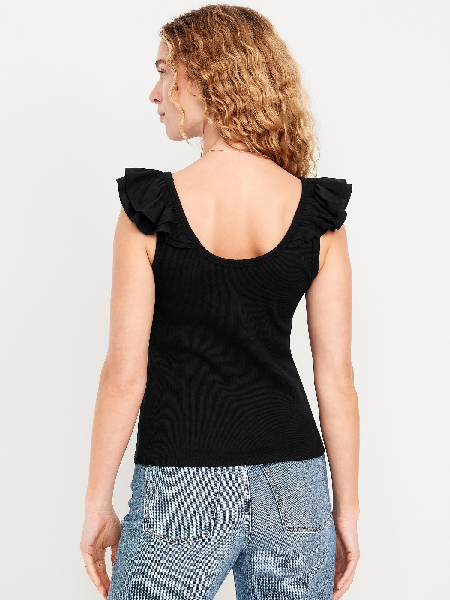 Ruffle-Trim Mixed Material Top: v-neck, ruffled sleeve openings, #686637