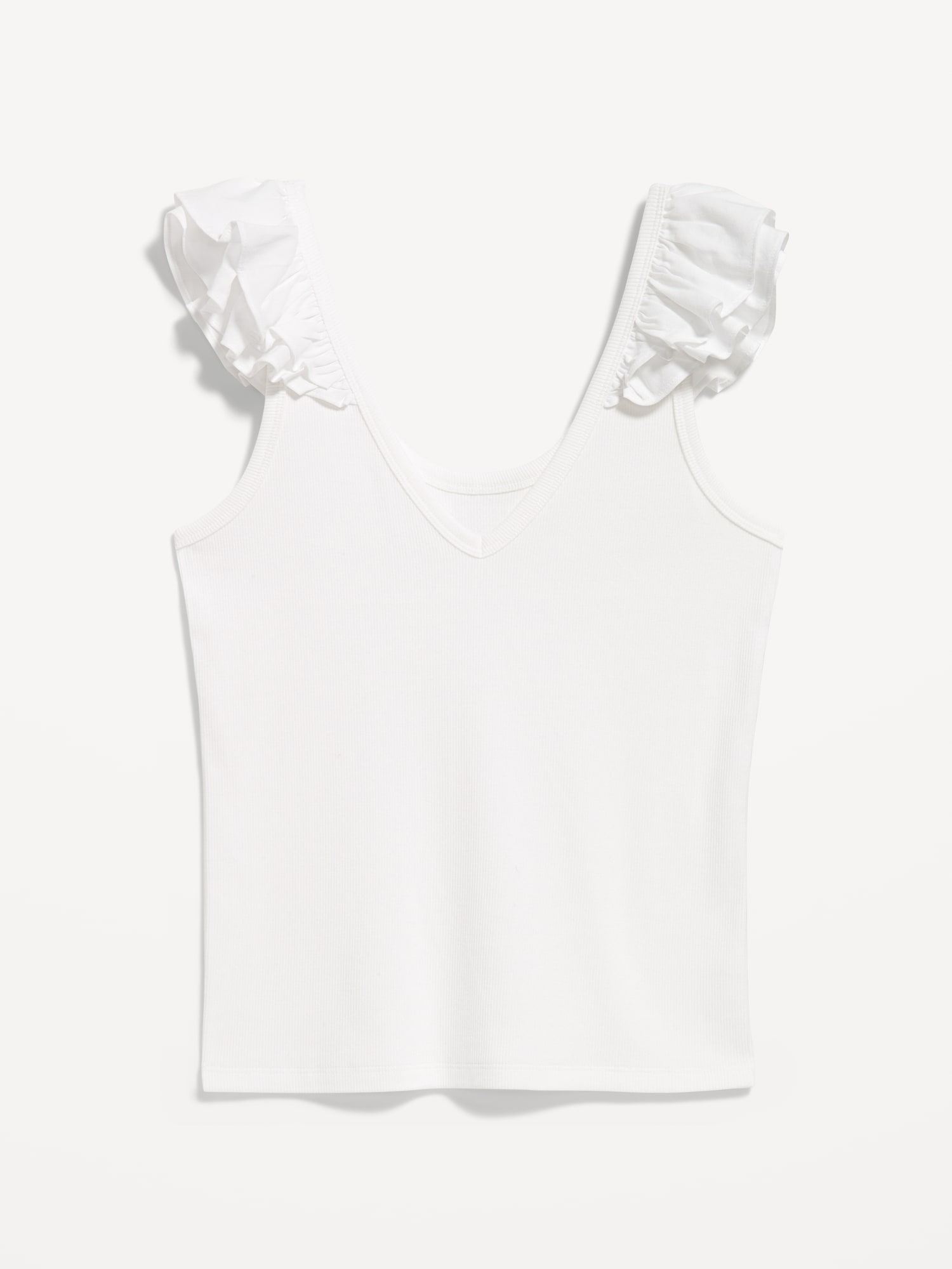 Ruffle-Trim Mixed Material Top: v-neck, ruffled sleeve openings, #686637