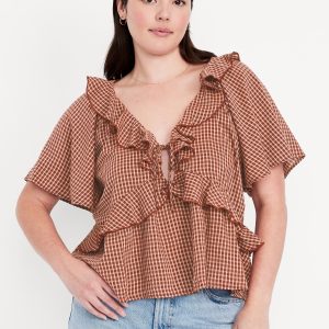 Ruffle V-Neck Top: tie-front v-neck, ruffle overlay at front, short flutter sleeves, #805737