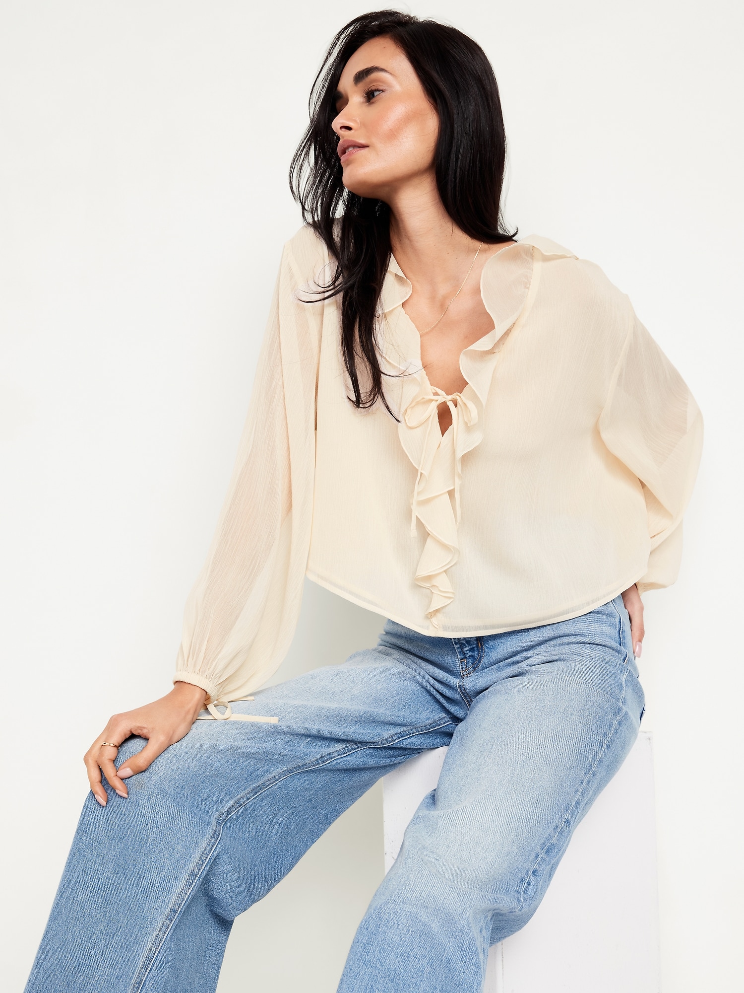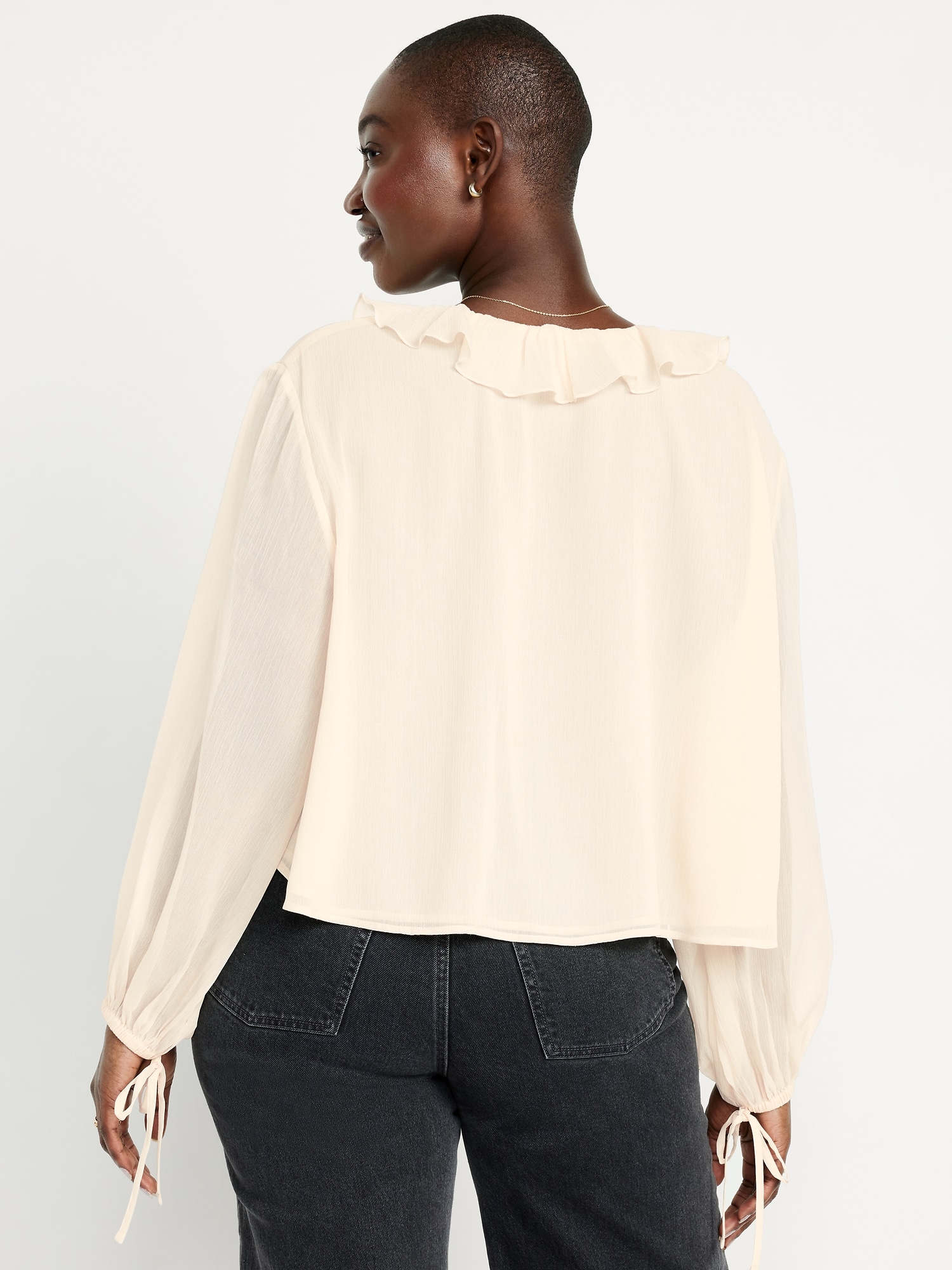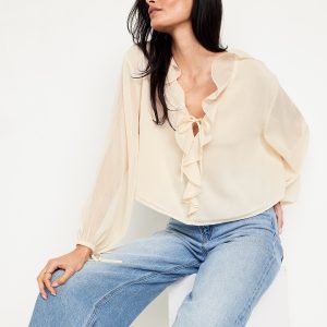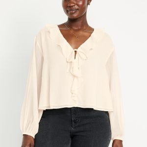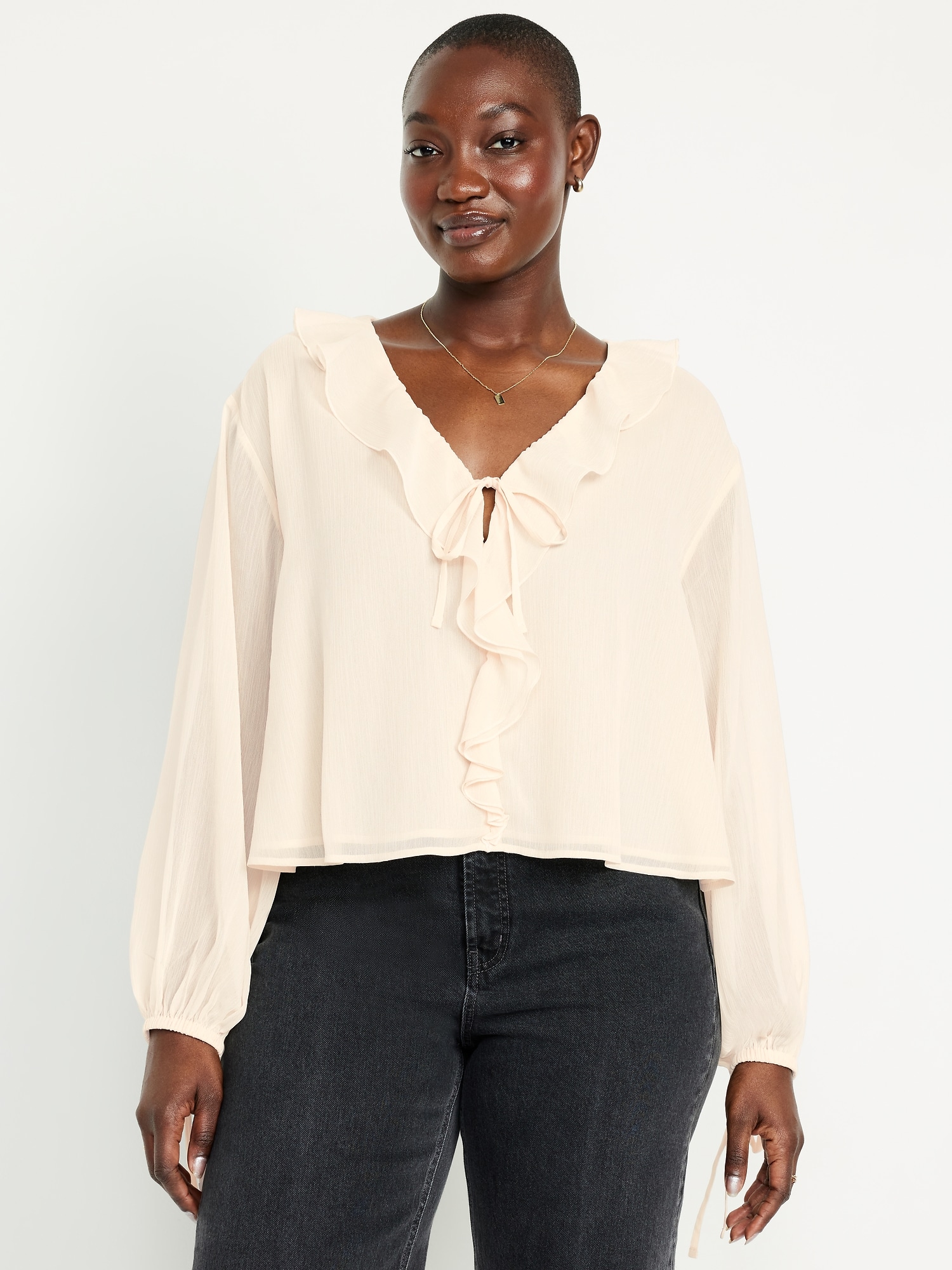 Ruffled Chiffon Cropped Blouse: ruffled v-neck, long drop-shoulder sleeves, elastic tie cuffs, decorative tie front, #704110