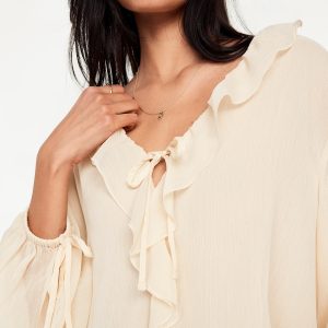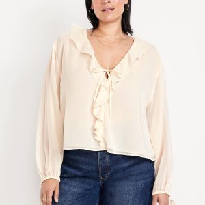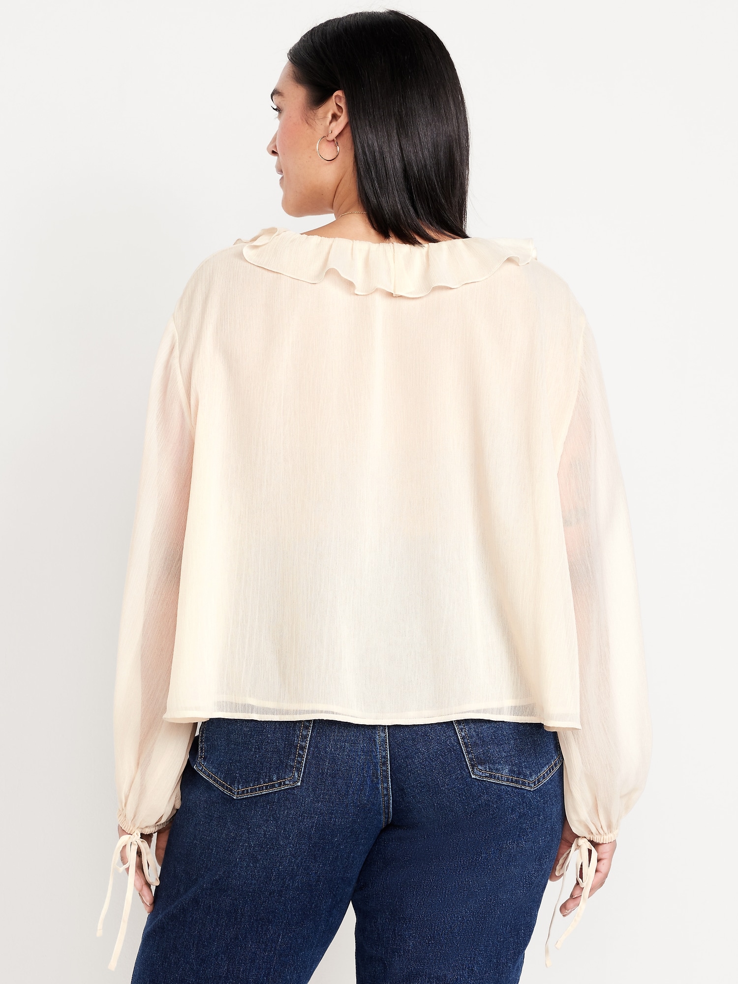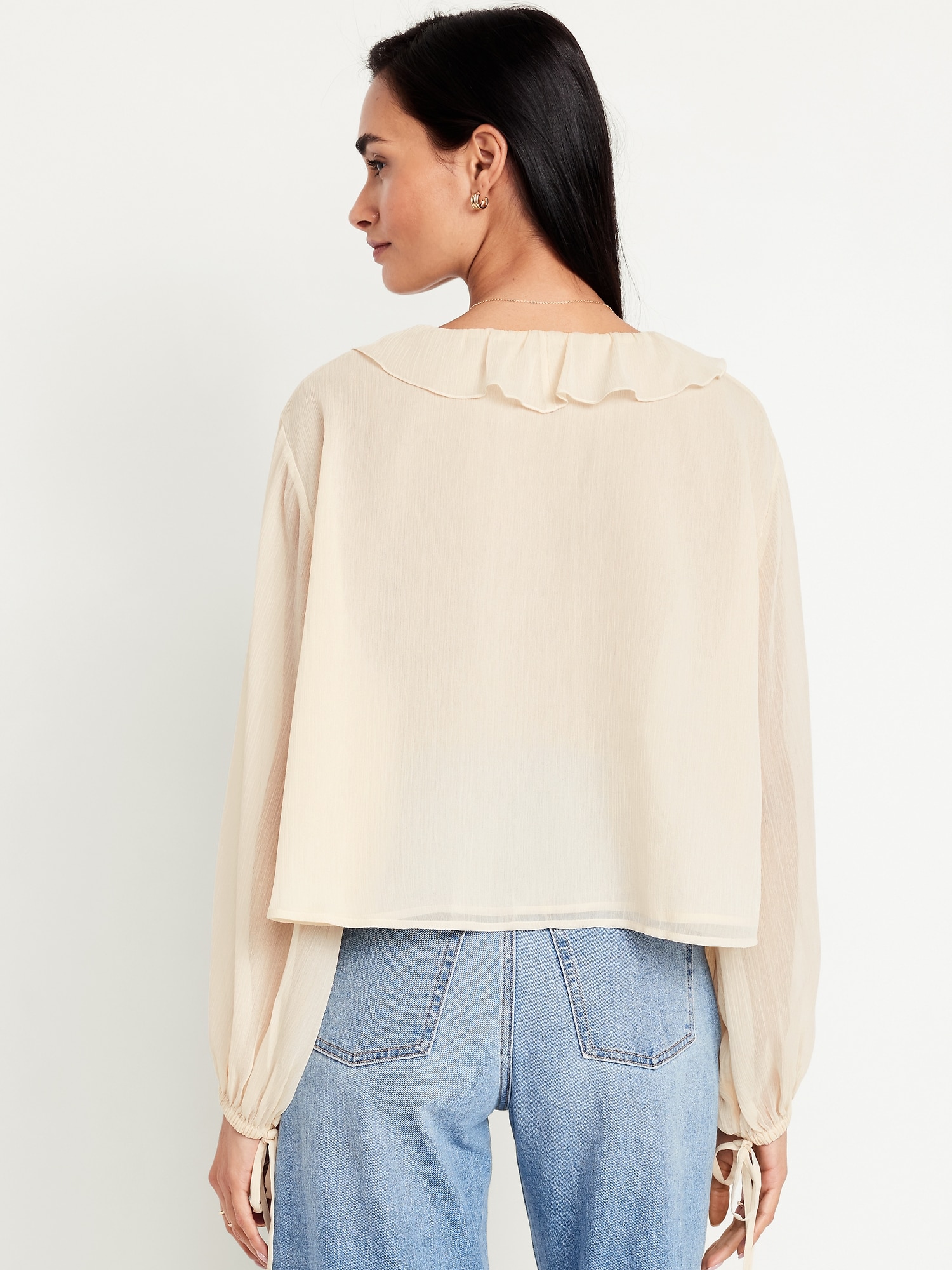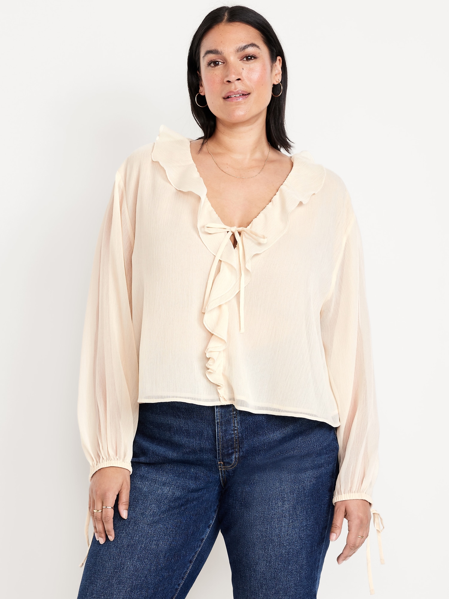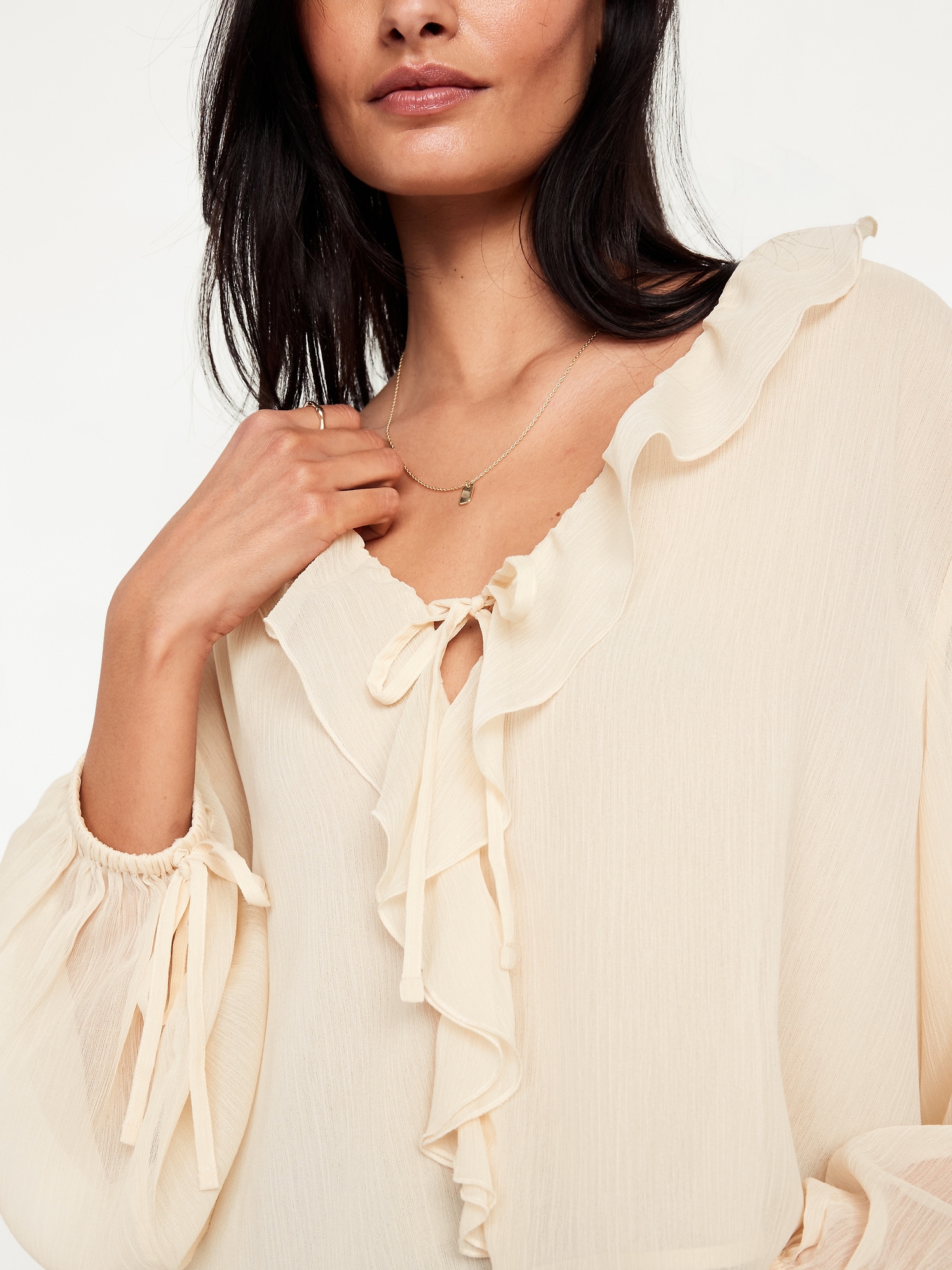 Ruffled Chiffon Cropped Blouse: ruffled v-neck, long drop-shoulder sleeves, elastic tie cuffs, decorative tie front, #704110