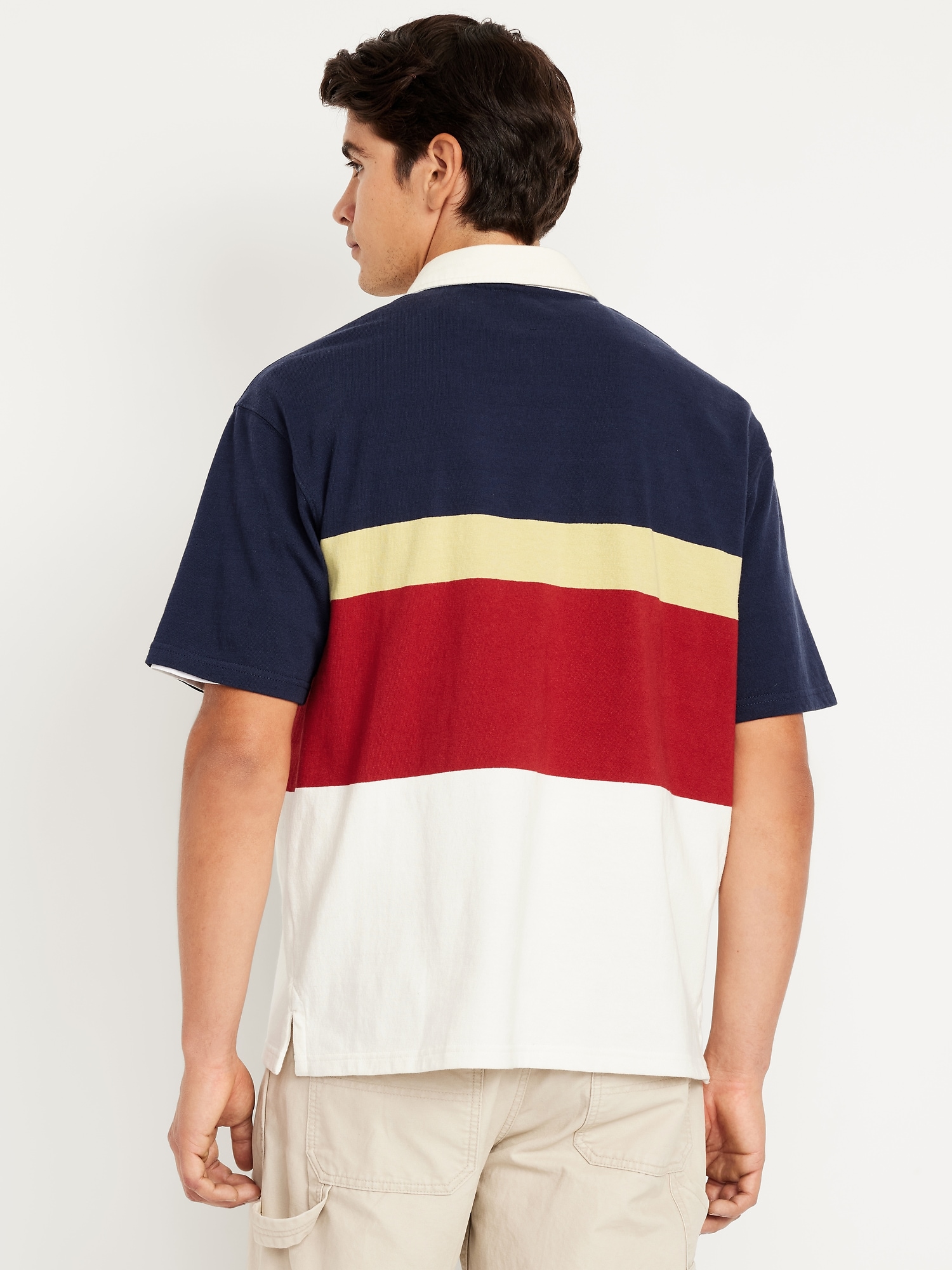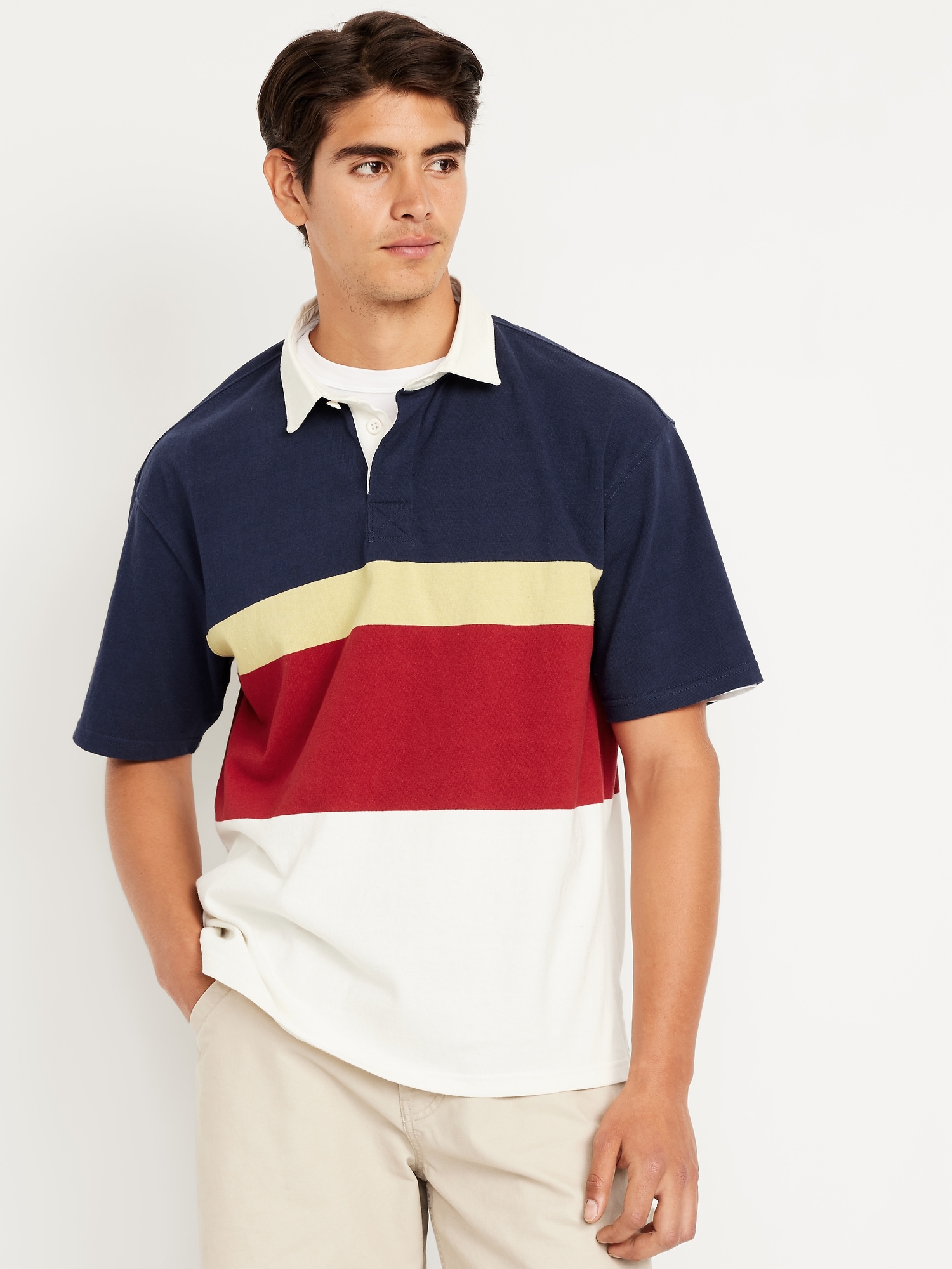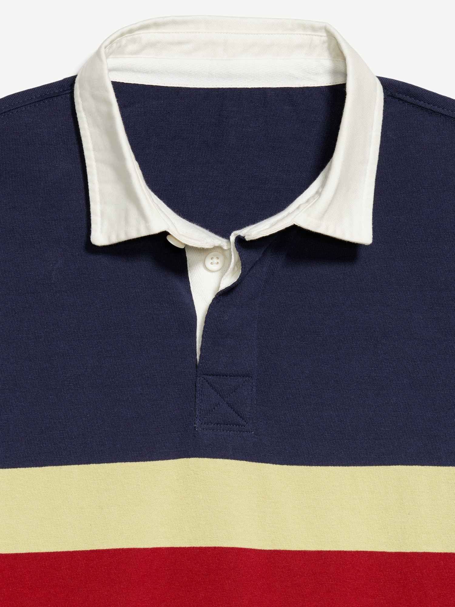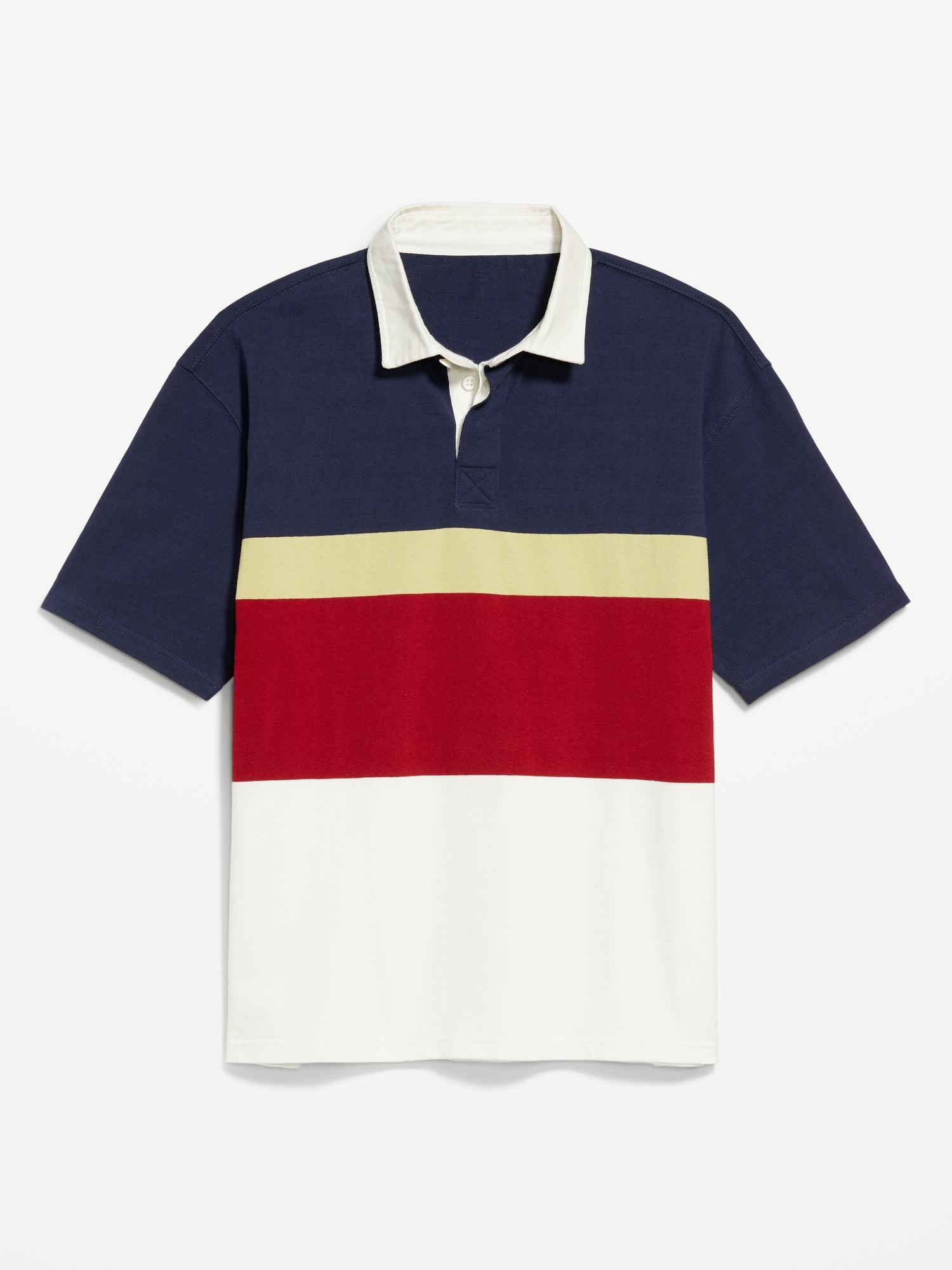 Rugby Stripe Polo: spread collar, short sleeves, buttoned placket, contrasting rugby-style stripes, vented sides, #762339