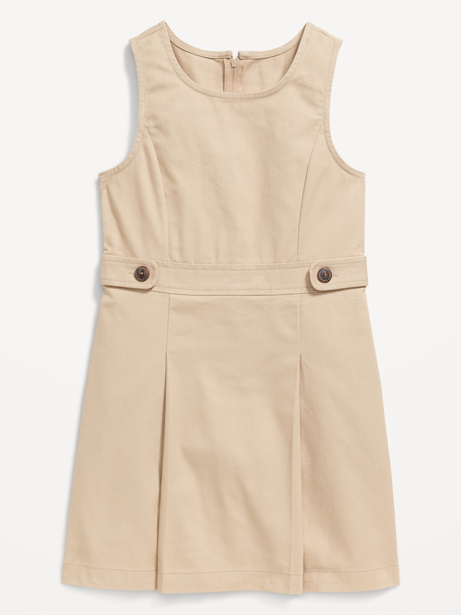 School Uniform Sleeveless Pleated Dress for Girls: scoop neck, sleeveless, full length zipper at back, decorative button tabs at waist, pleated skirt, #766641