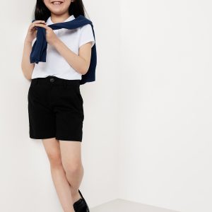 School Uniform Twill Bermuda Shorts for Girls: interior adjustable waistband, snap-button closure in sizes 5-8, regular button closure in sizes 10-20, zip fly, diagonal on-seam hip pockets, welt faux pockets at back, #767123