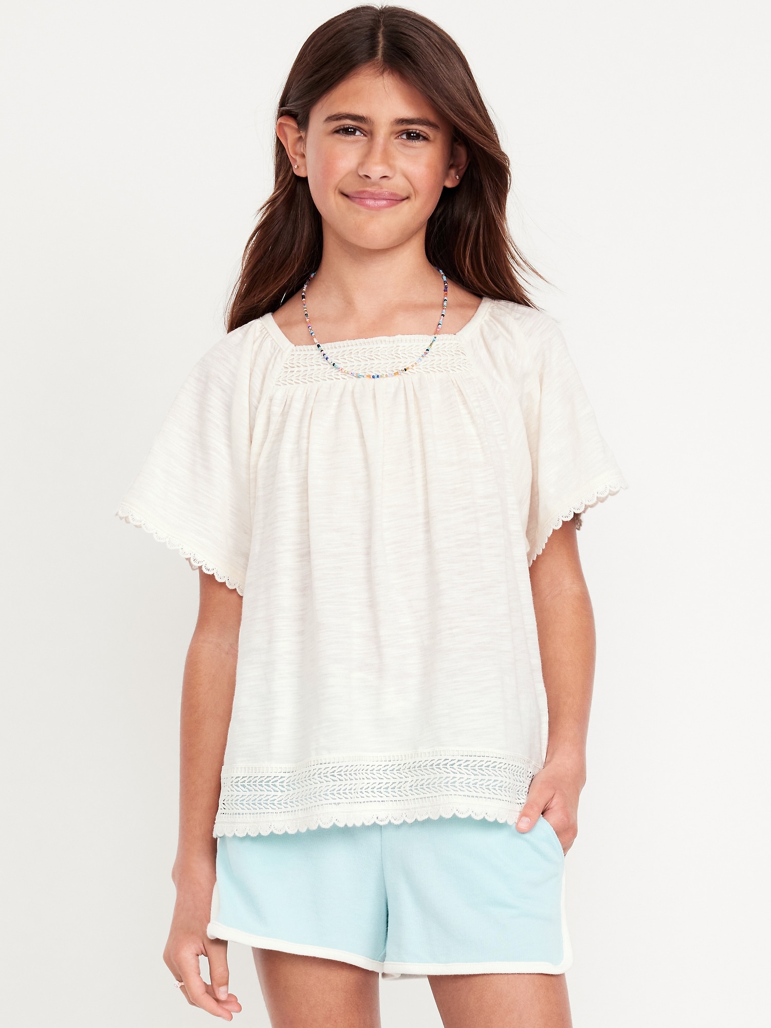 Short Flutter-Sleeve Crochet-Trim Top for Girls: square neckline, short flutter sleeves, crochet-knit trim, online exclusive, #767940