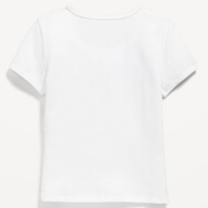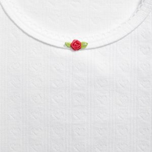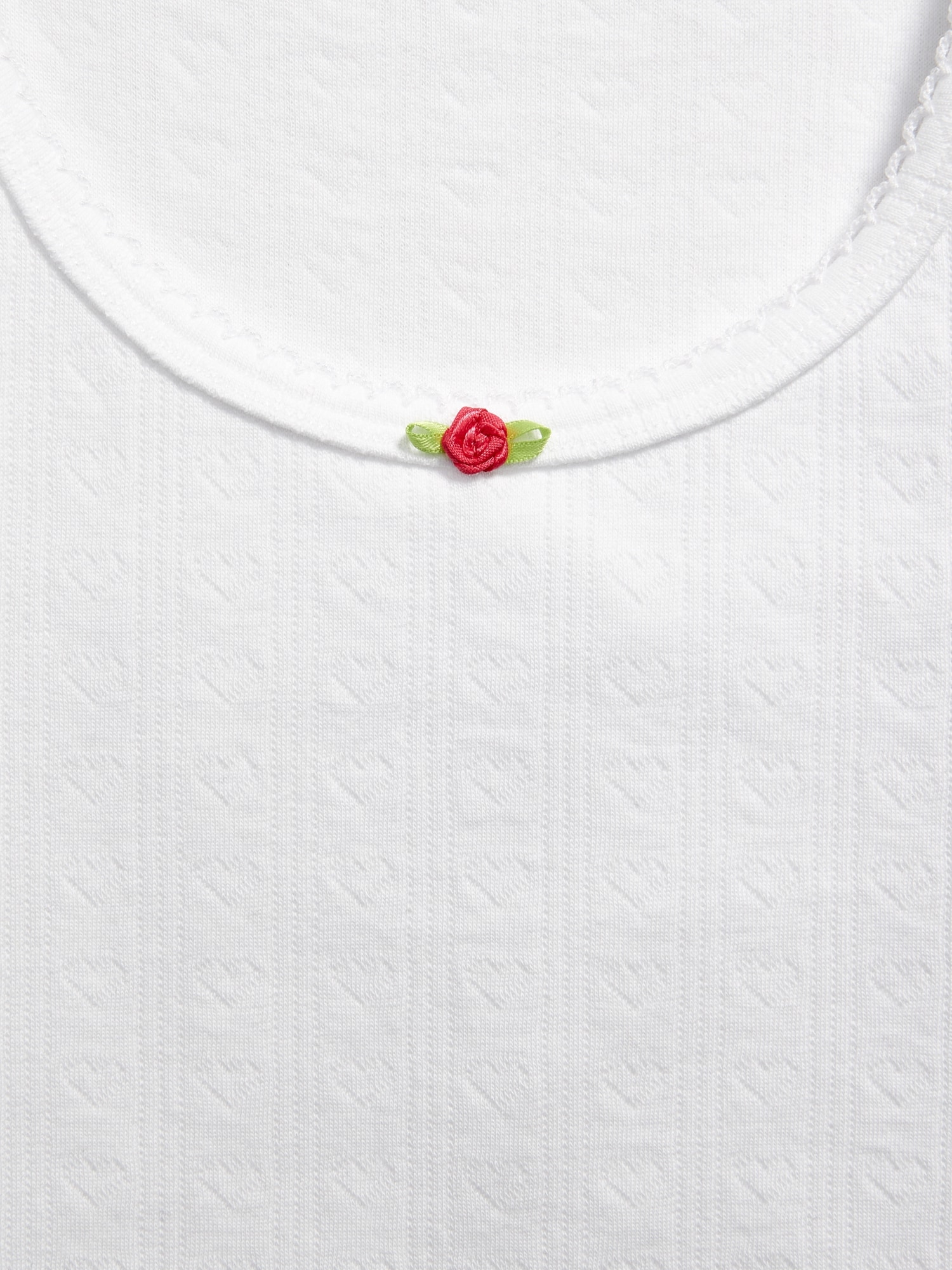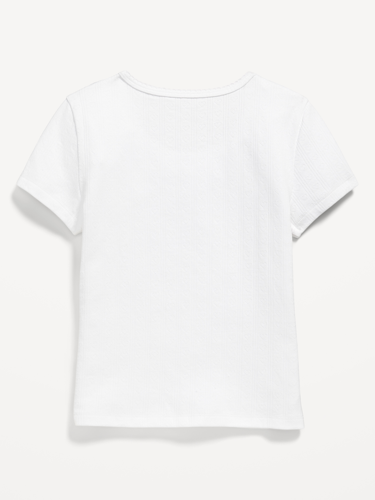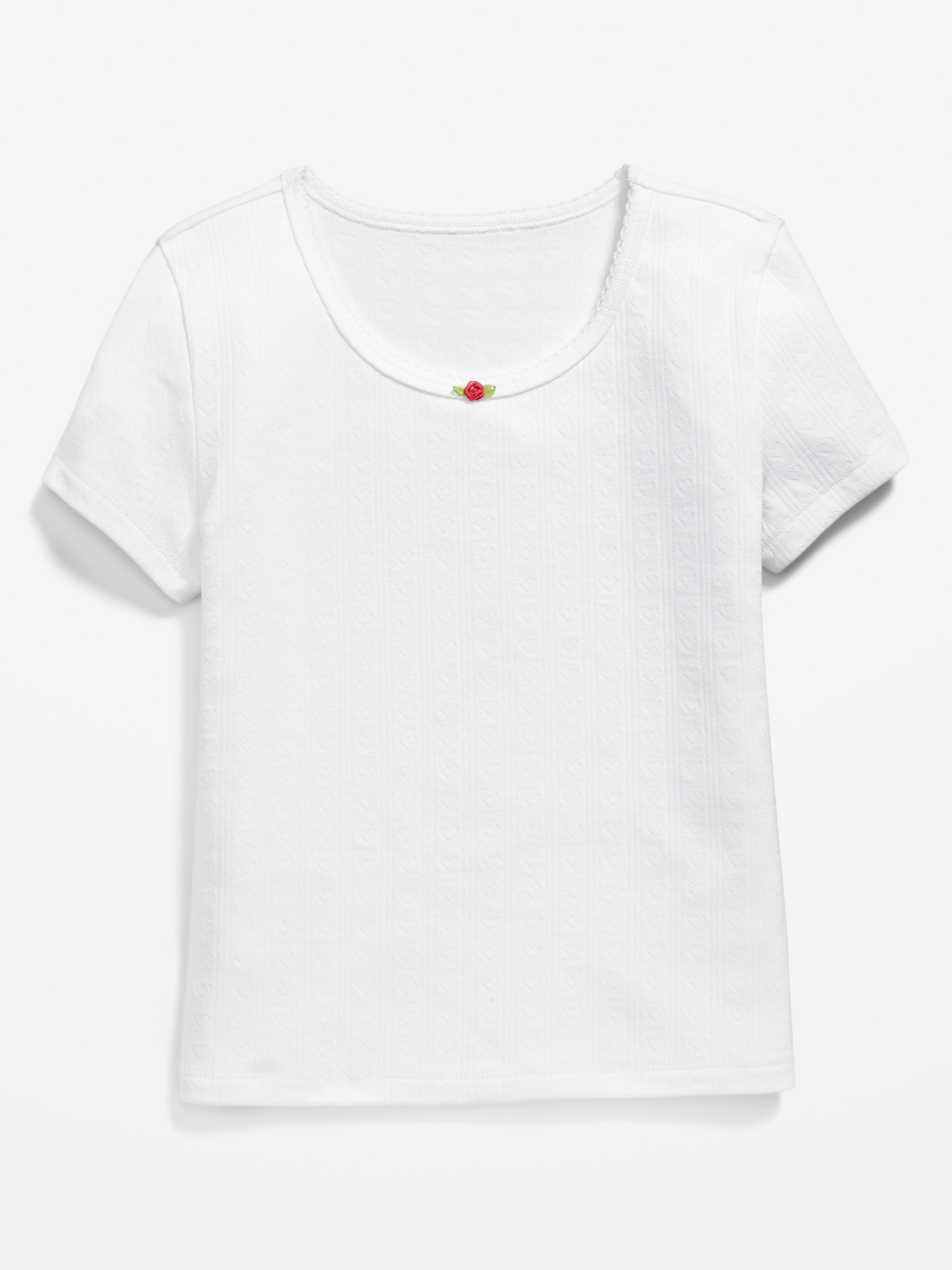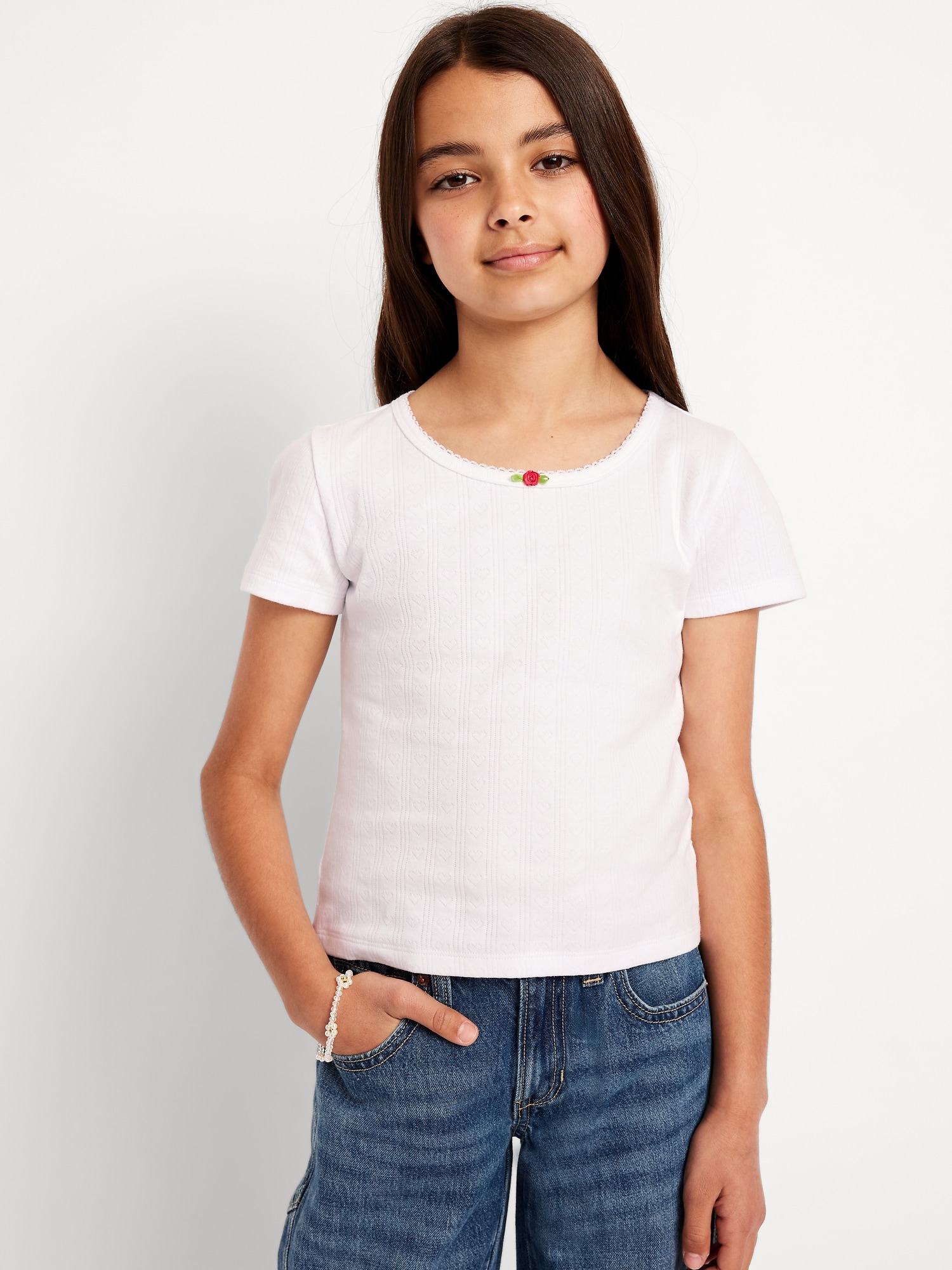 Short-Sleeve Pointelle-Knit Top for Girls: crew neck, picot trim along neckline, short sleeves, all-over floral print, #766971