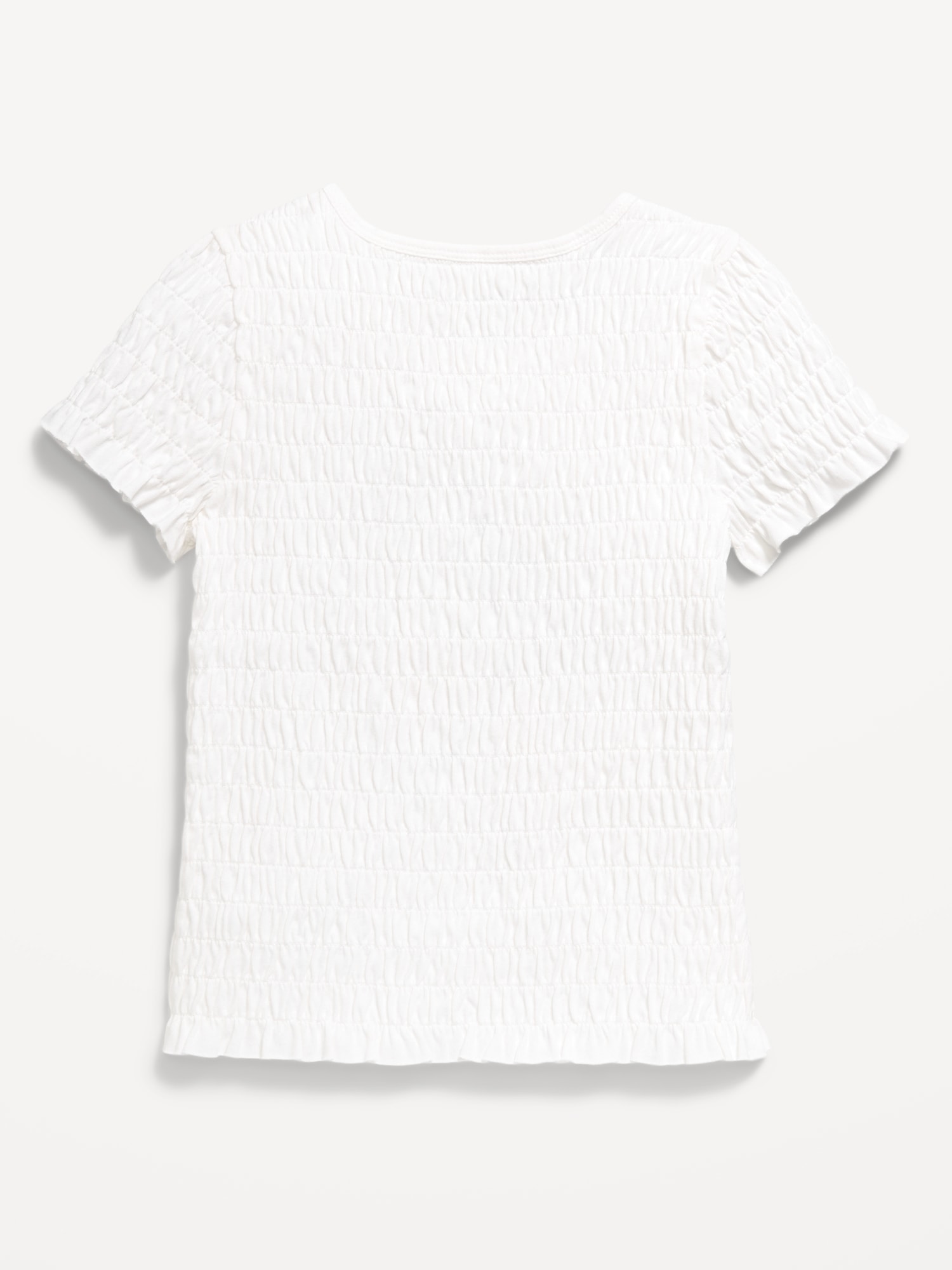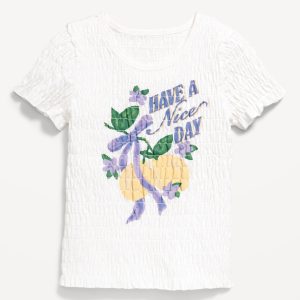 Short-Sleeve Smocked Graphic T-Shirt for Girls: scoop neck, short sleeves, graphic at front of, all-over textured smocking, #685279