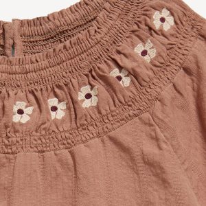 Short-Sleeve Textured Embroidered Top for Girls: smocked neckline, keyhole cutout with button loop closure at nape, embroidered floral pattern along neck, short sleeves, #806079
