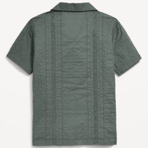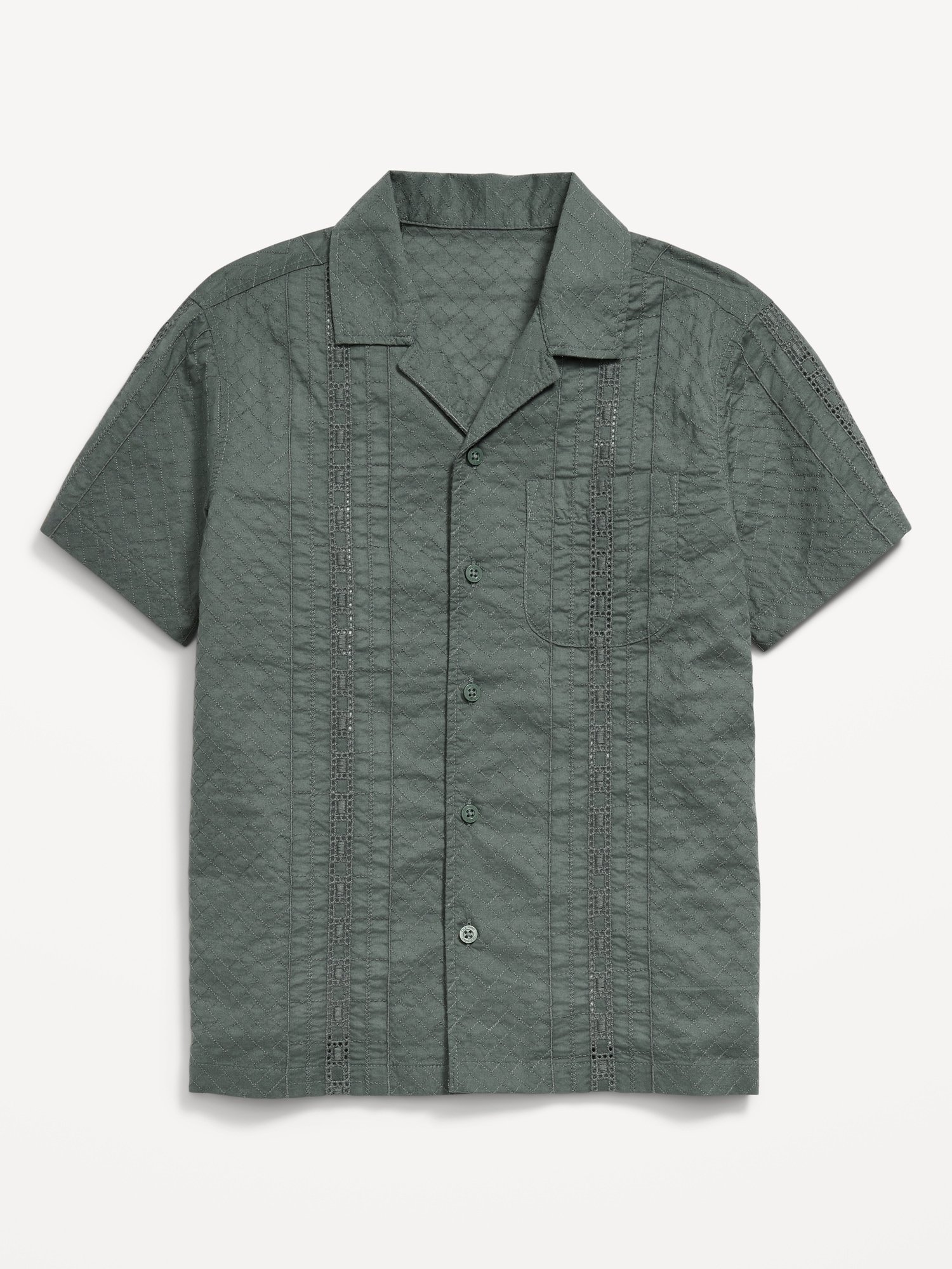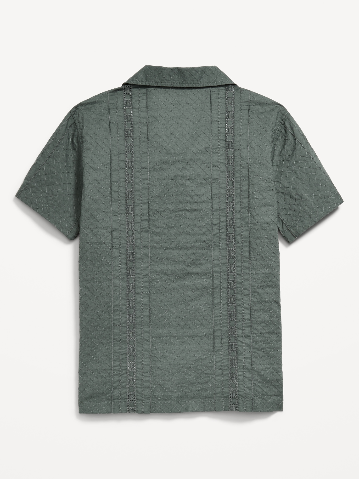 Short-Sleeve Textured Pocket Shirt for Boys: spread collar, short sleeves, patch pocket at chest, full length button front, all-over textured pattern, #664490