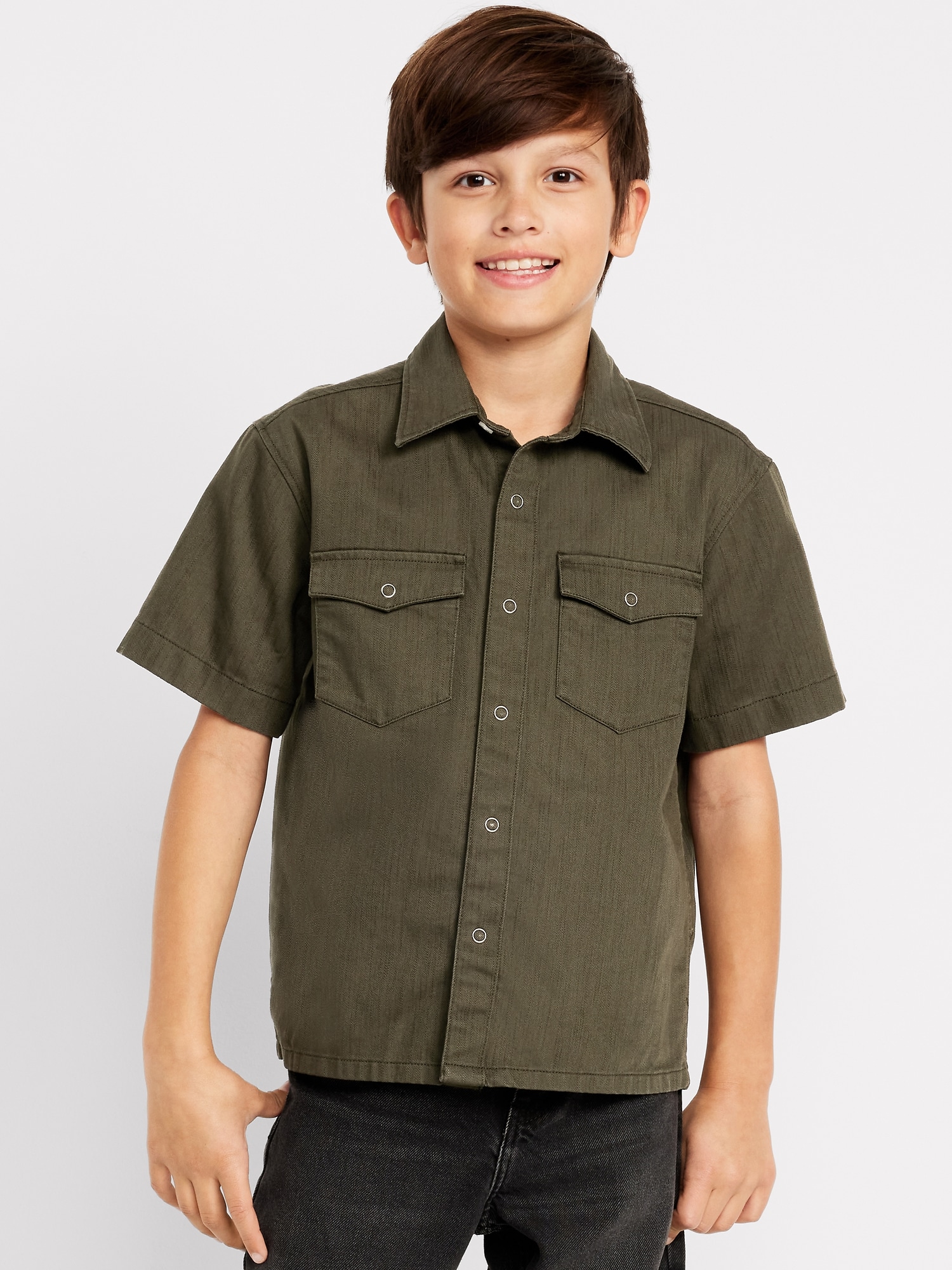 Short-Sleeve Western Pocket Shirt for Boys: pointed collar, short sleeves, snap-button flap pockets at chest, full length snap-button placket, #790172
