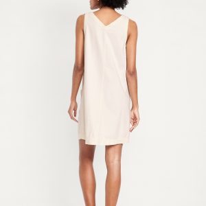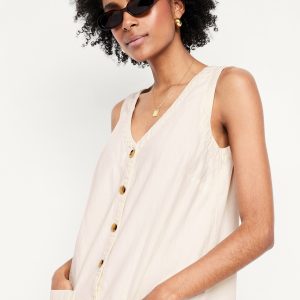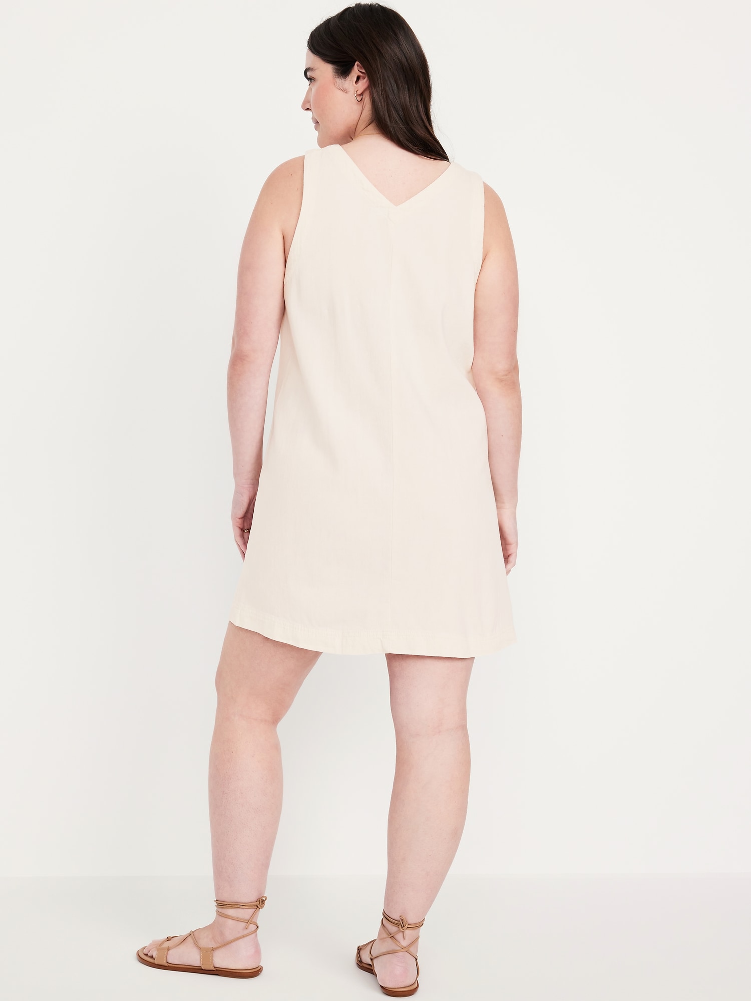 Sleeveless Button-Front Mini Dress: v-neck, wide straps, button front, patch pockets, #766910