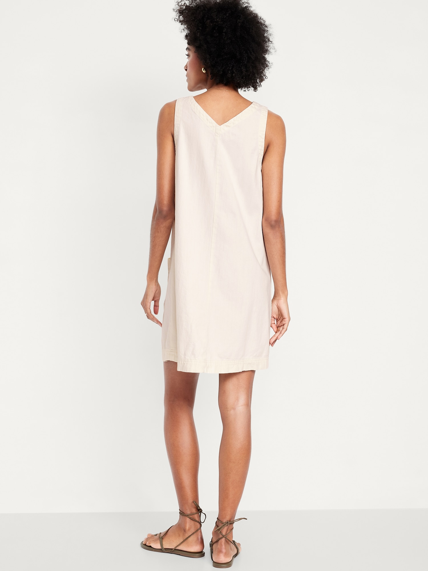 Sleeveless Button-Front Mini Dress: v-neck, wide straps, button front, patch pockets, #766910