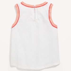 Sleeveless Crochet-Trim Top for Girls: round neckline, sleeveless, button closure and keyhole cutout at nape, crochet knit trim along neckline and sleeve cuffs, rounded hem, #767961