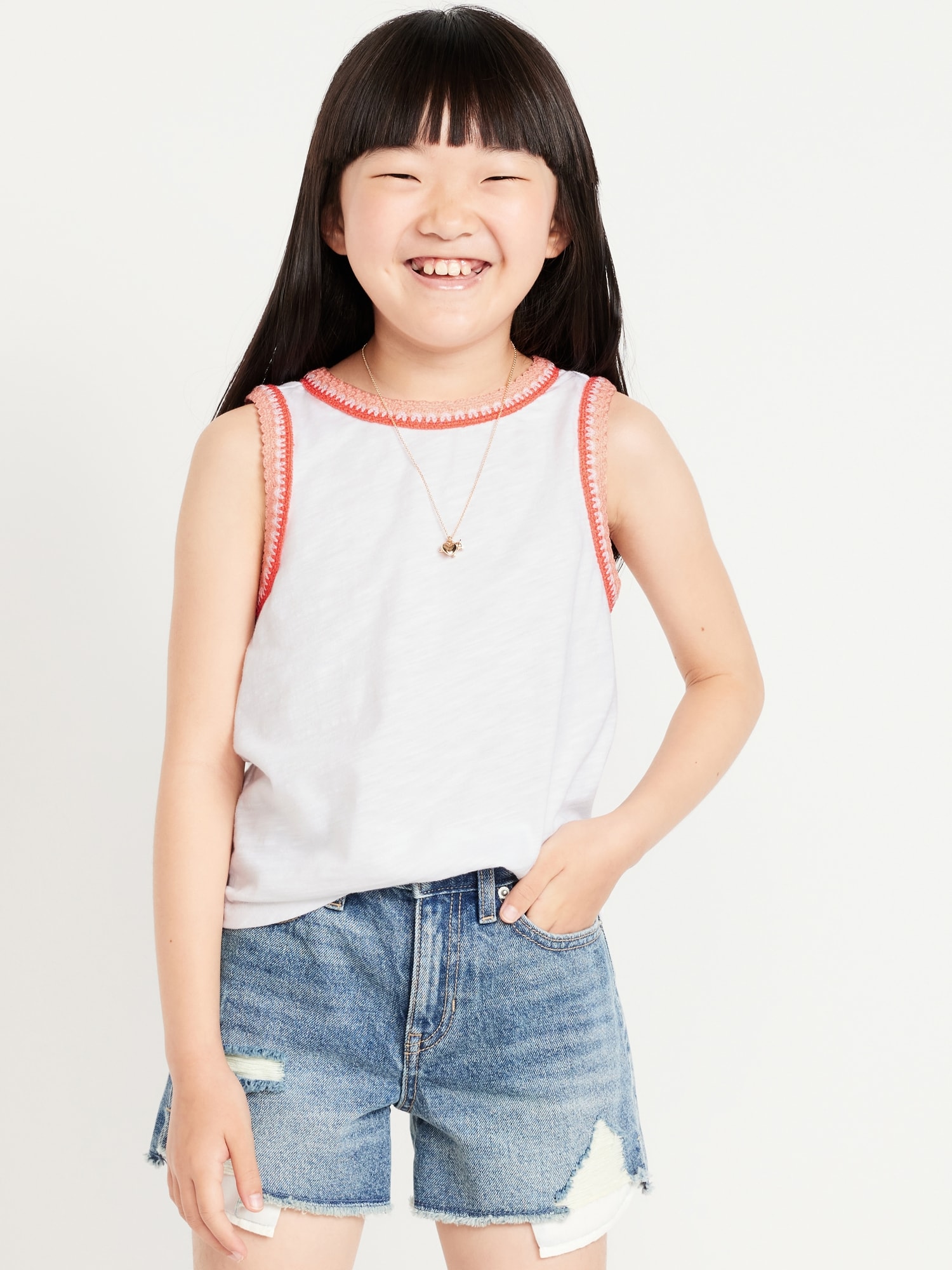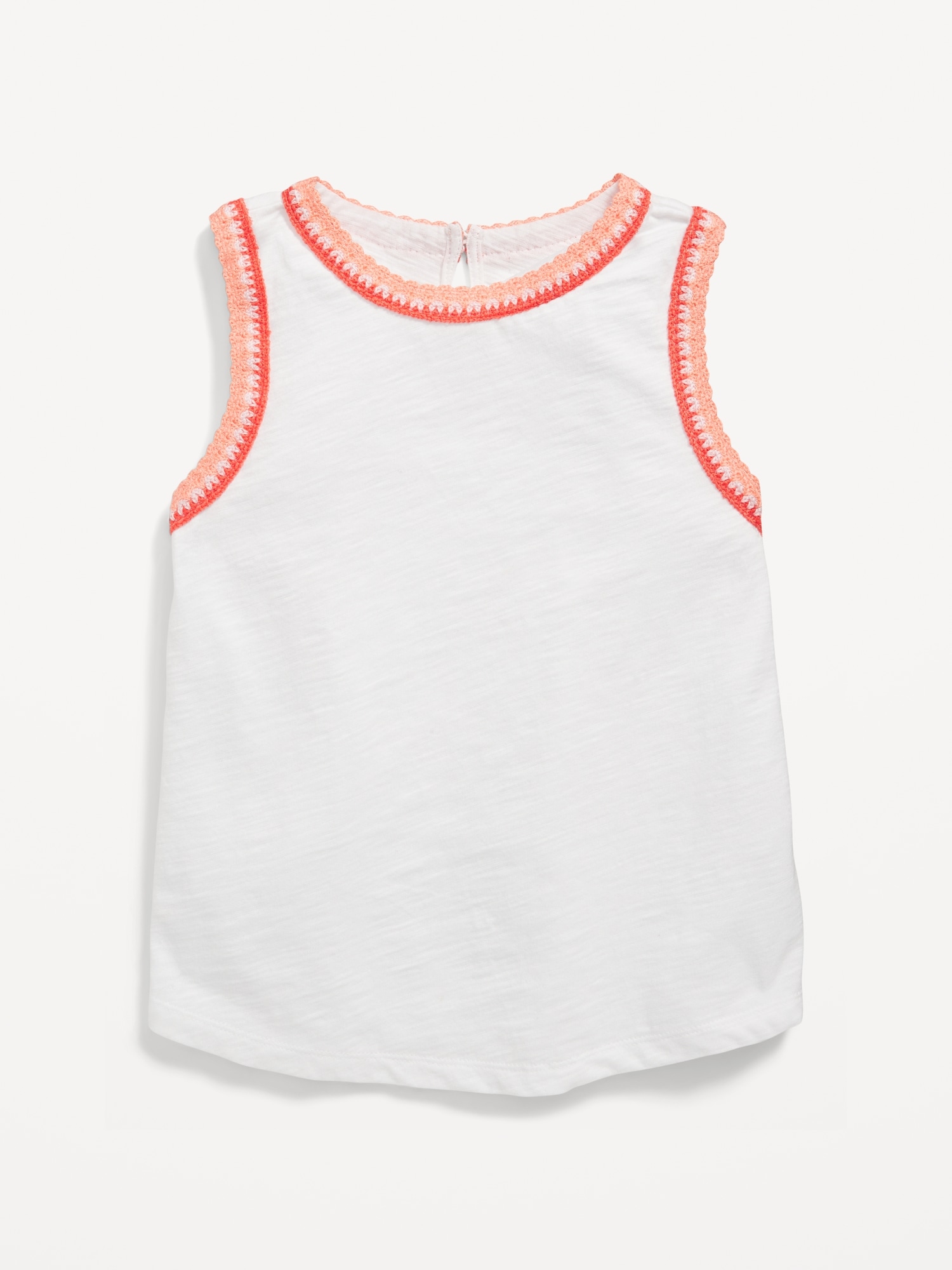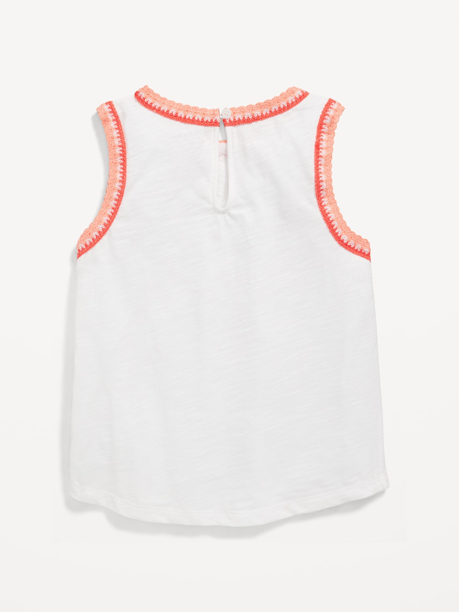 Sleeveless Crochet-Trim Top for Girls: round neckline, sleeveless, button closure and keyhole cutout at nape, crochet knit trim along neckline and sleeve cuffs, rounded hem, #767961