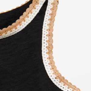 Sleeveless Crochet-Trim Top for Girls: round neckline, sleeveless, button closure and keyhole cutout at nape, crochet knit trim along neckline and sleeve cuffs, rounded hem, #767961