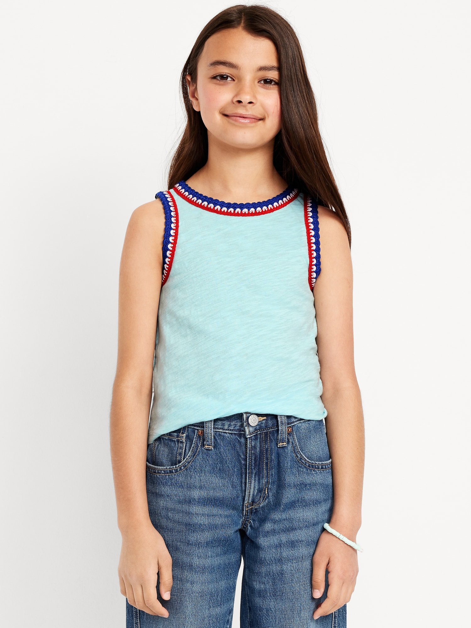 Sleeveless Crochet-Trim Top for Girls: round neckline, sleeveless, button closure and keyhole cutout at nape, crochet knit trim along neckline and sleeve cuffs, rounded hem, #767961