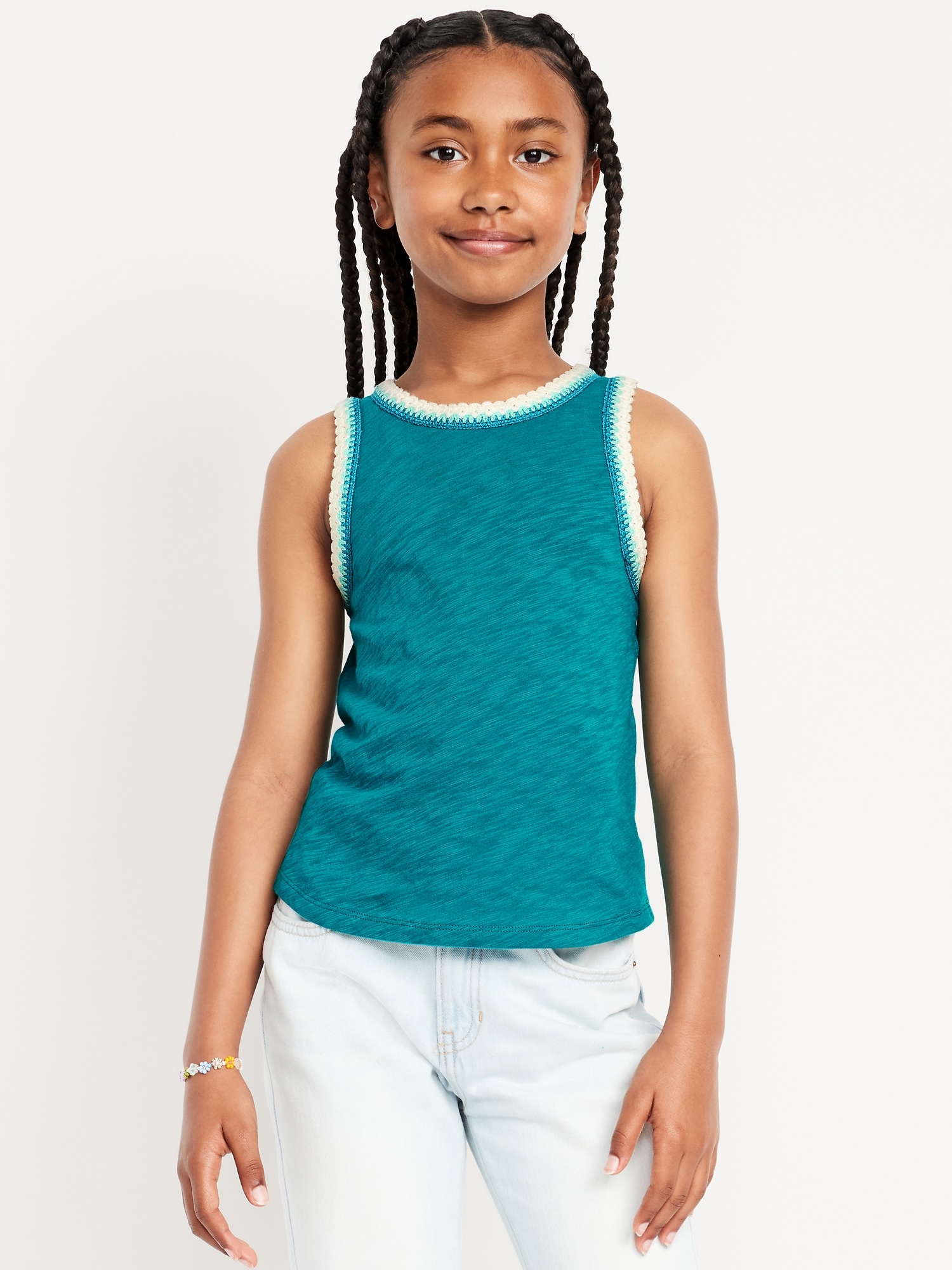 Sleeveless Crochet-Trim Top for Girls: round neckline, sleeveless, button closure and keyhole cutout at nape, crochet knit trim along neckline and sleeve cuffs, rounded hem, #767961