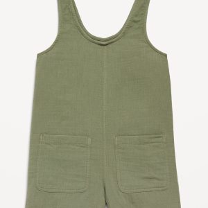 Sleeveless Double-Weave Pocket Romper for Girls: deep scoop neck, sleeveless, patch pockets at front, rolled leg cuffs, #766632