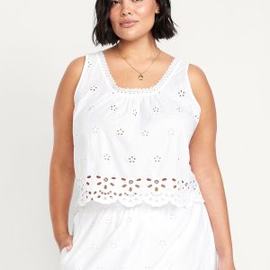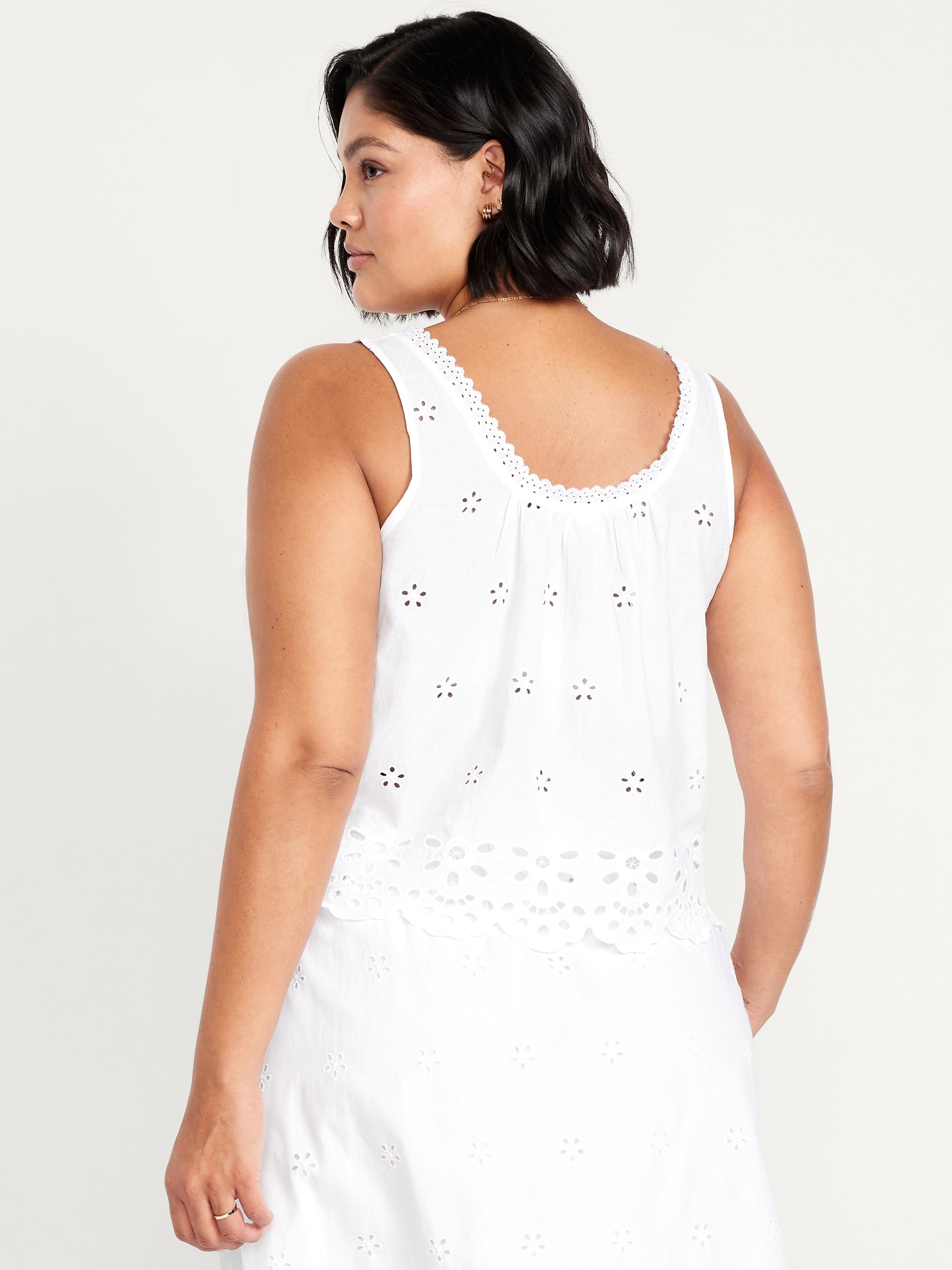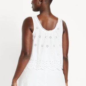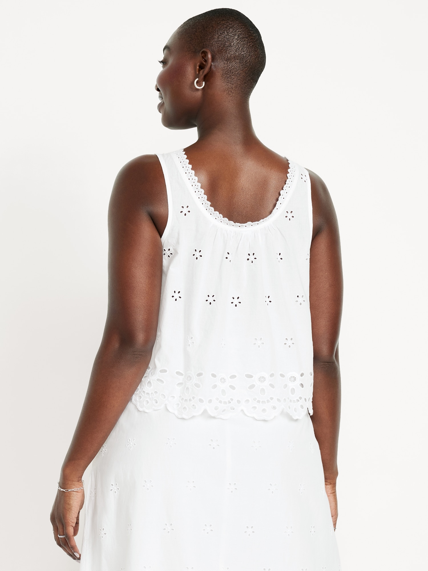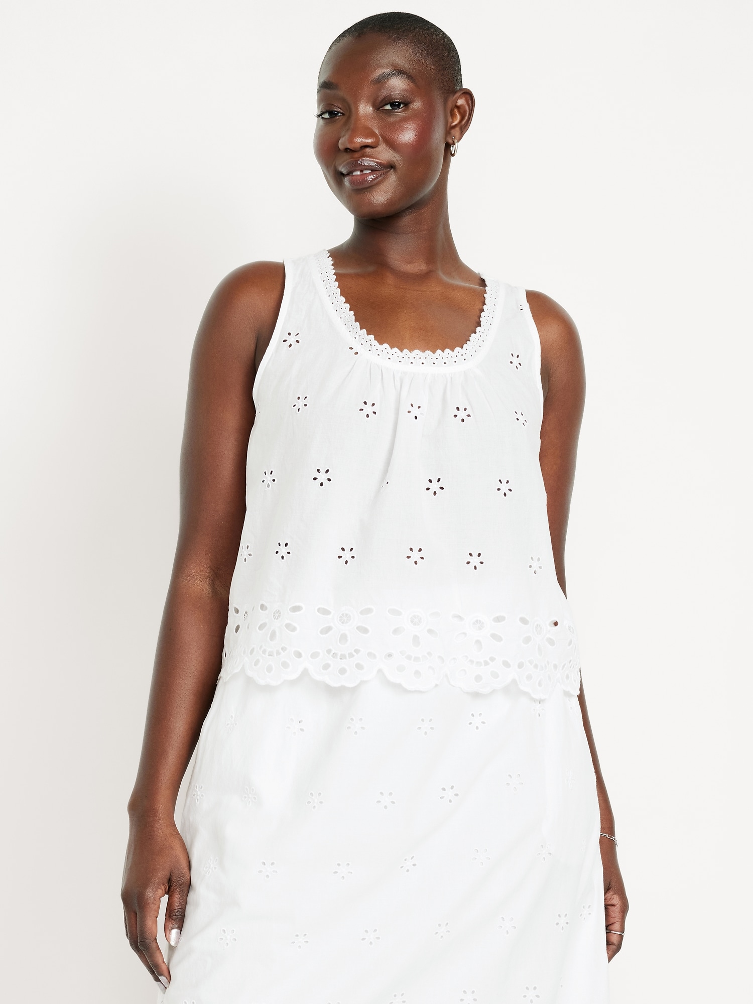 Sleeveless Eyelet Top: lace-trim scoop neck, eyelet detail, scallop hem, #704096