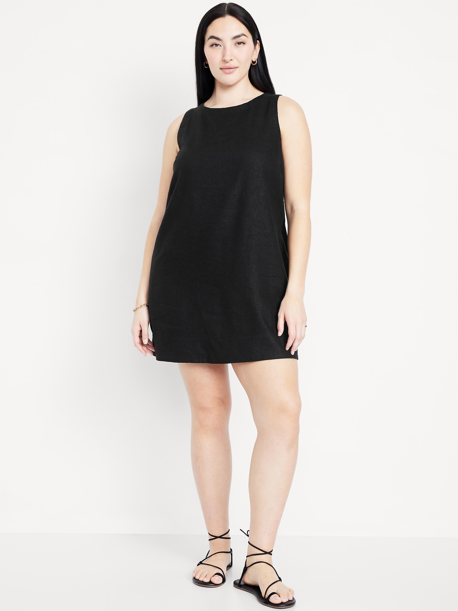 Sleeveless Linen-Blend Mini Shift Dress: high neck, sleeveless, side-seam pockets, button-loop closure at nape, darted bust, all-over floral and fruit print, #766928