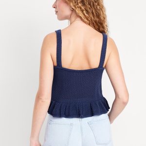 Sleeveless Open-Stitch Peplum Sweater: scoop neck, wide straps, floral appliqué accents, ruffled peplum hem, #761610