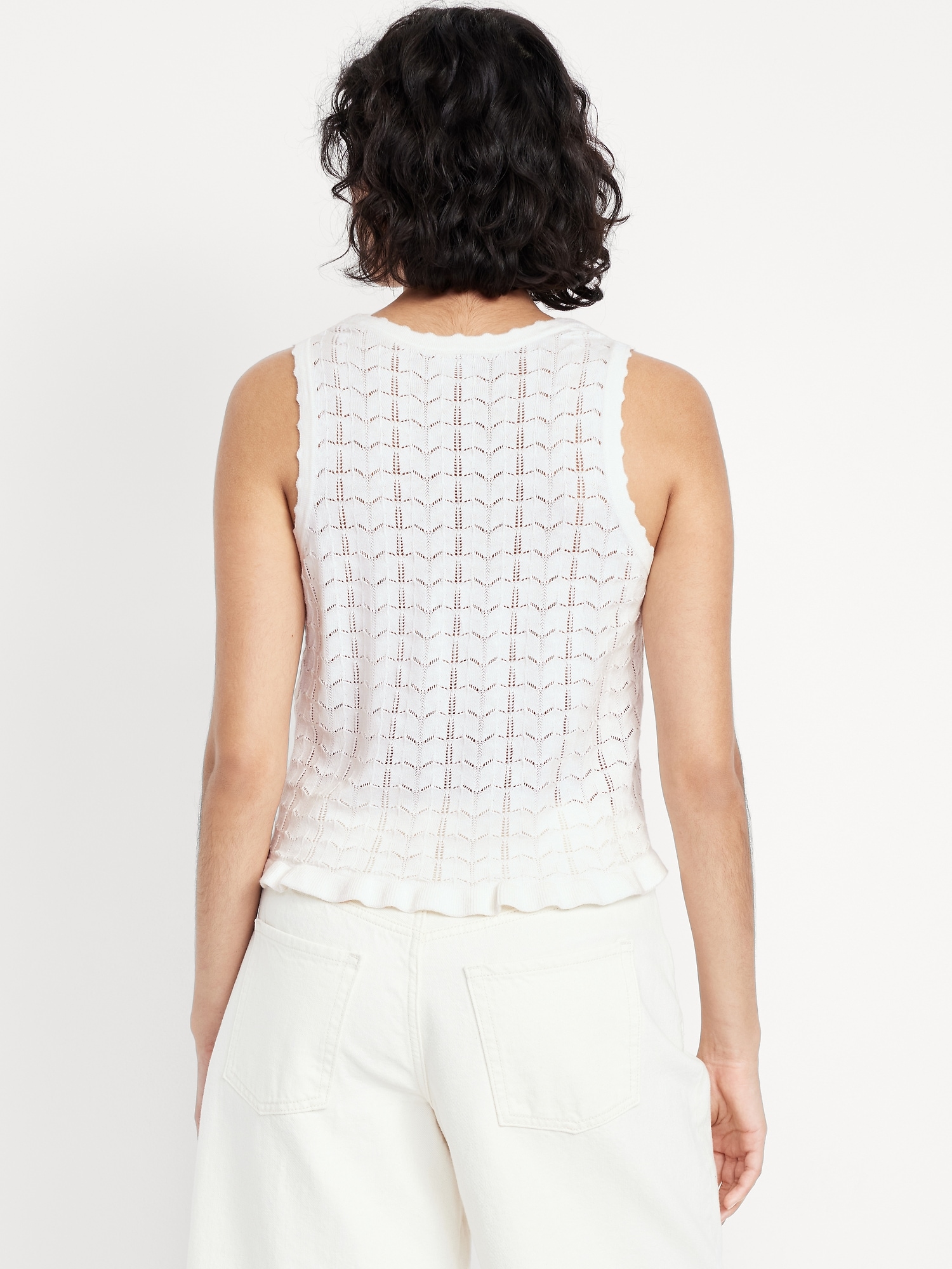 Sleeveless Pointelle Cropped Henley Top: scoop neck, wide straps, button-henley placket, ruffled hem, #785032