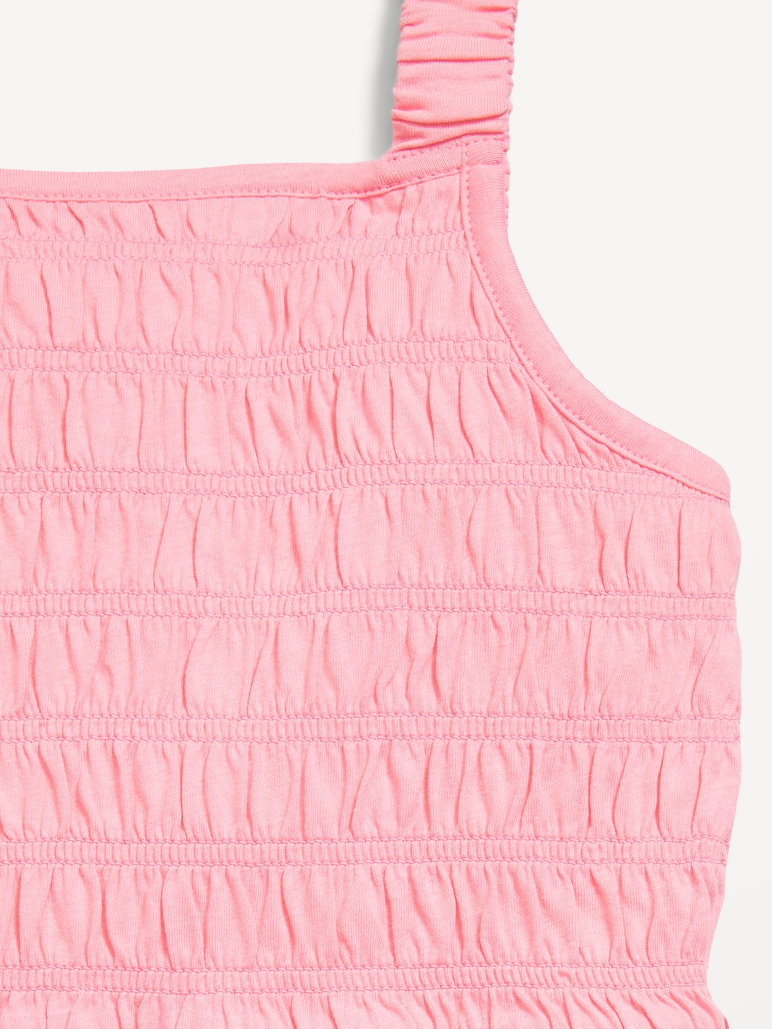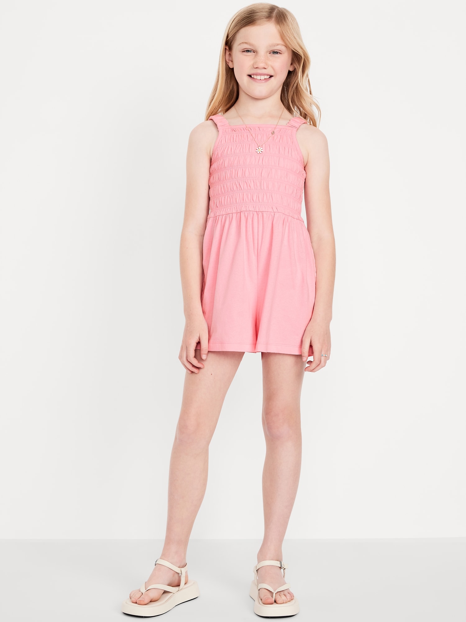 Sleeveless Smocked Romper for Girls: square neckline, wide shoulder straps, smocked bodice, on-seam side pockets, all-over print, #766671
