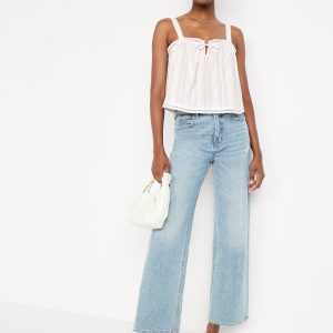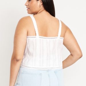 Sleeveless Textured-Dobby Top: wide straps, notched tie-front accent, crochet-lace trim, shirred detail, #764188