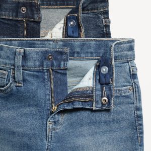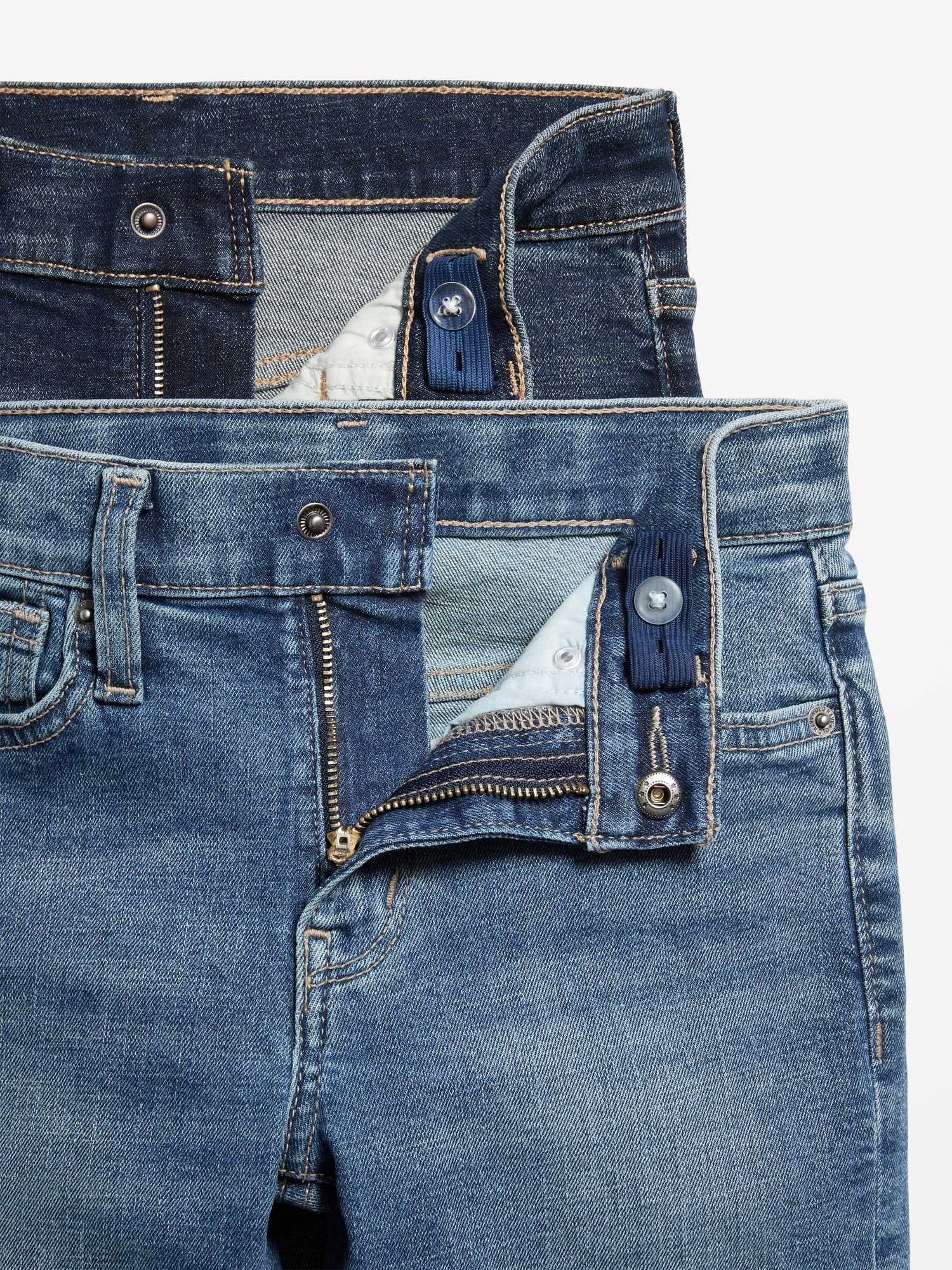 Slim 360° Stretch Jeans 2-pack for Boys: Comfy, durable, wear-on-repeat faves.pack includes 2 pairs of jeans, one in a medium wash and the other a dark wash, interior adjustable waistband, snap-button closure in sizes 5-8, regular button closure in sizes 10-20, zip fly, scoop pockets and coin pocket in front, patch pockets in back, #428001