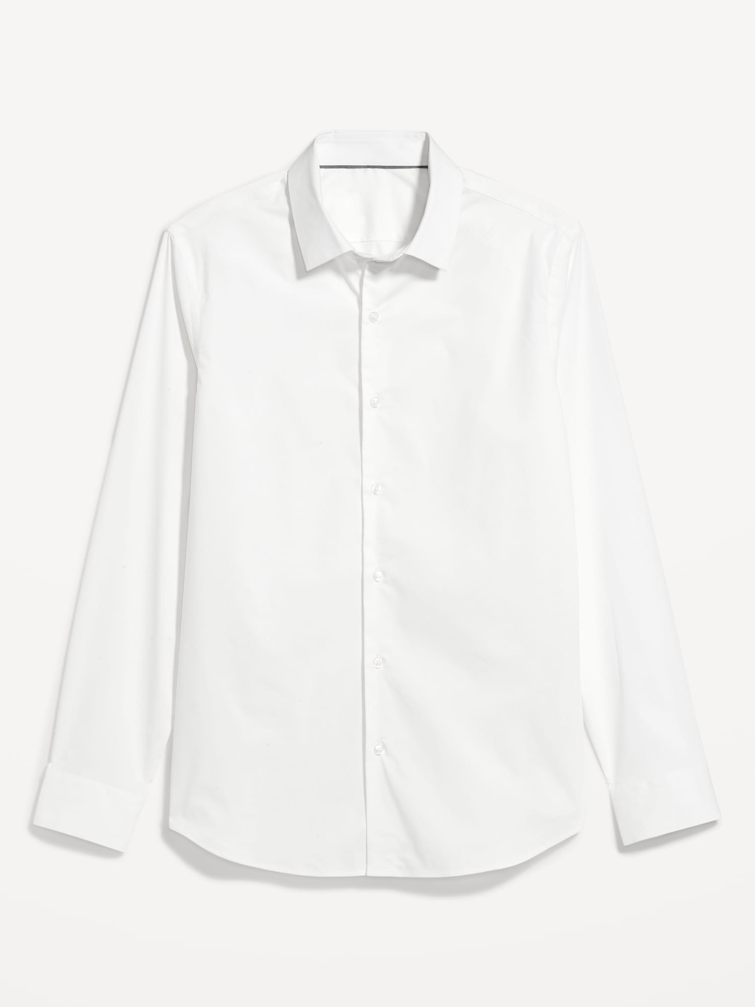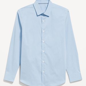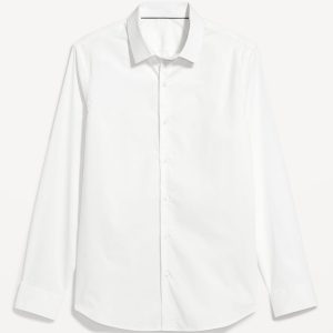 Slim Fit Pro Signature Performance Dress Shirt: 2″ pointed collar, built-in collar stays, long sleeves, buttoned cuffs, full-button front, breathable, quick drying, go-dry wicks moisture, #418101