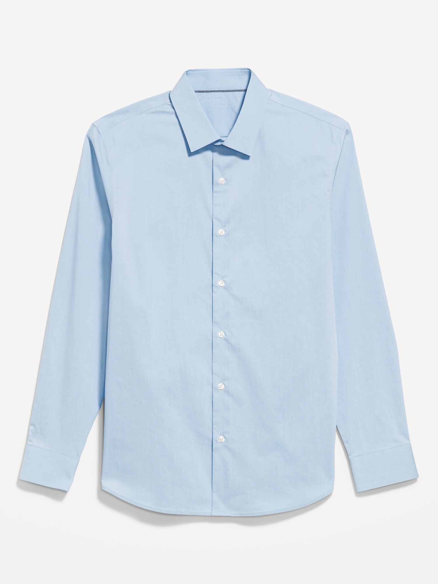 Slim Fit Pro Signature Performance Dress Shirt: 2″ pointed collar, built-in collar stays, long sleeves, buttoned cuffs, full-button front, breathable, quick drying, go-dry wicks moisture, #418101