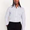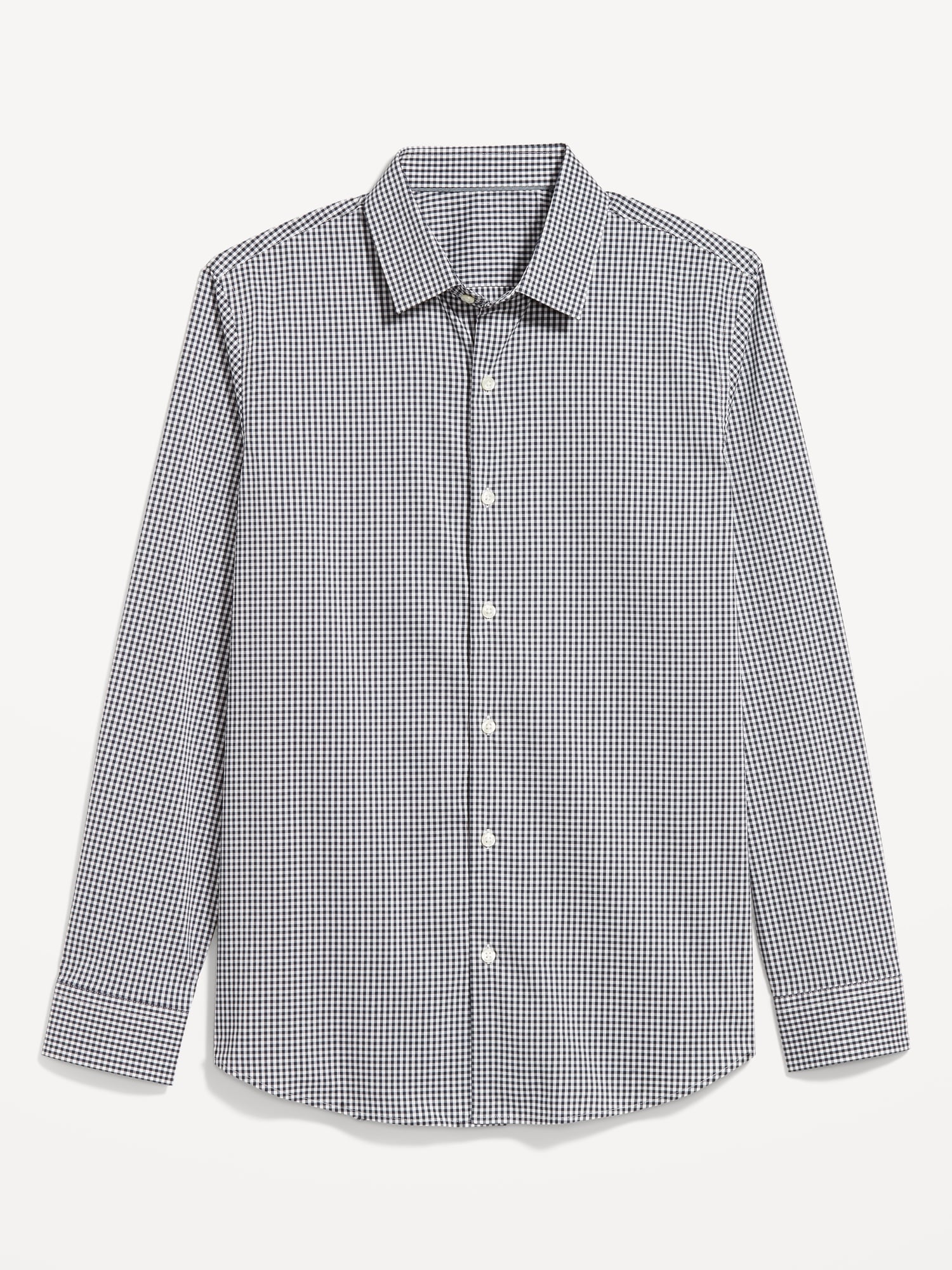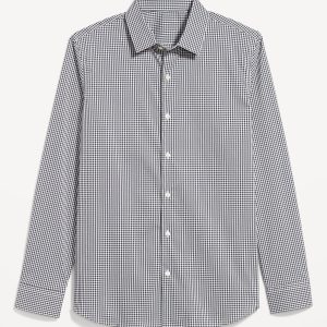 Slim Fit Pro Signature Performance Dress Shirt: 2″ pointed collar, built-in collar stays, long sleeves, buttoned cuffs, full-button front, breathable, quick drying, go-dry wicks moisture, #418101